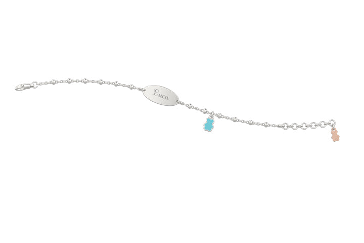 Il raffinato bracciale in puro argento 925 della linea Nanàn Bijou è rifinito nei dettagli, con una targhetta in cui inserire il tuo nome o quello del tuo bimbo. Due orsetti sono appesi al braccialetto. Dono prezioso, ricordo per la vita.