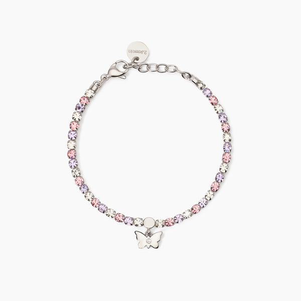 Bracciale tennis in acciaio 316L con cristalli multicolor Ø 3 mm, ciondolo farfalla 9.5x6.5 mm e cristallo Ø 1.5 mm, lunghezza regolabile da 15.5 a 18 cm