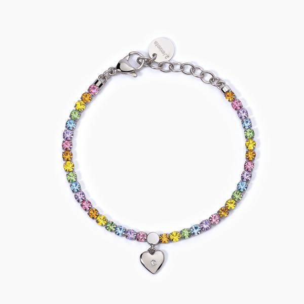 Bracciale tennis in acciaio 316L con cristalli multicolor Ø 3 mm, pendente cuore 8x8 mm e cristallo Ø 1.5 mm, lunghezza regolabile da 15 a 18.5 cm.
