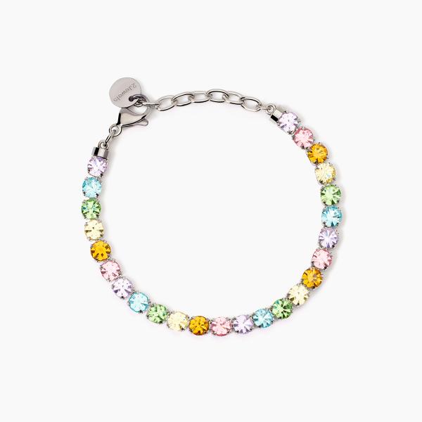 Bracciale tennis in acciaio 316L con cristalli multicolor Ø 5 mm, lunghezza regolabile da 16 a 19 cm.