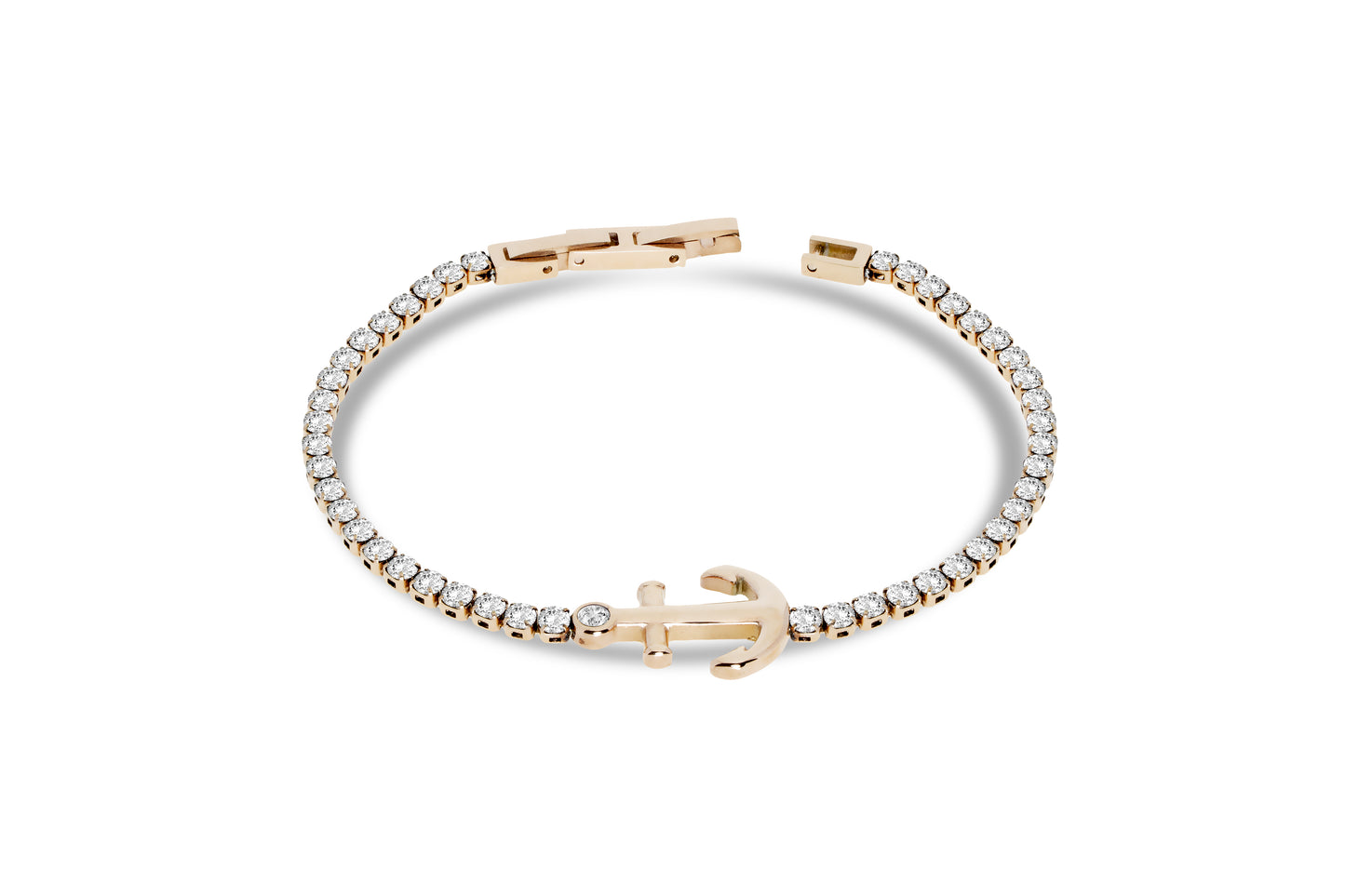 Bracciale tennis in acciaio rosé con zirconi bianchi e ancora centrale.