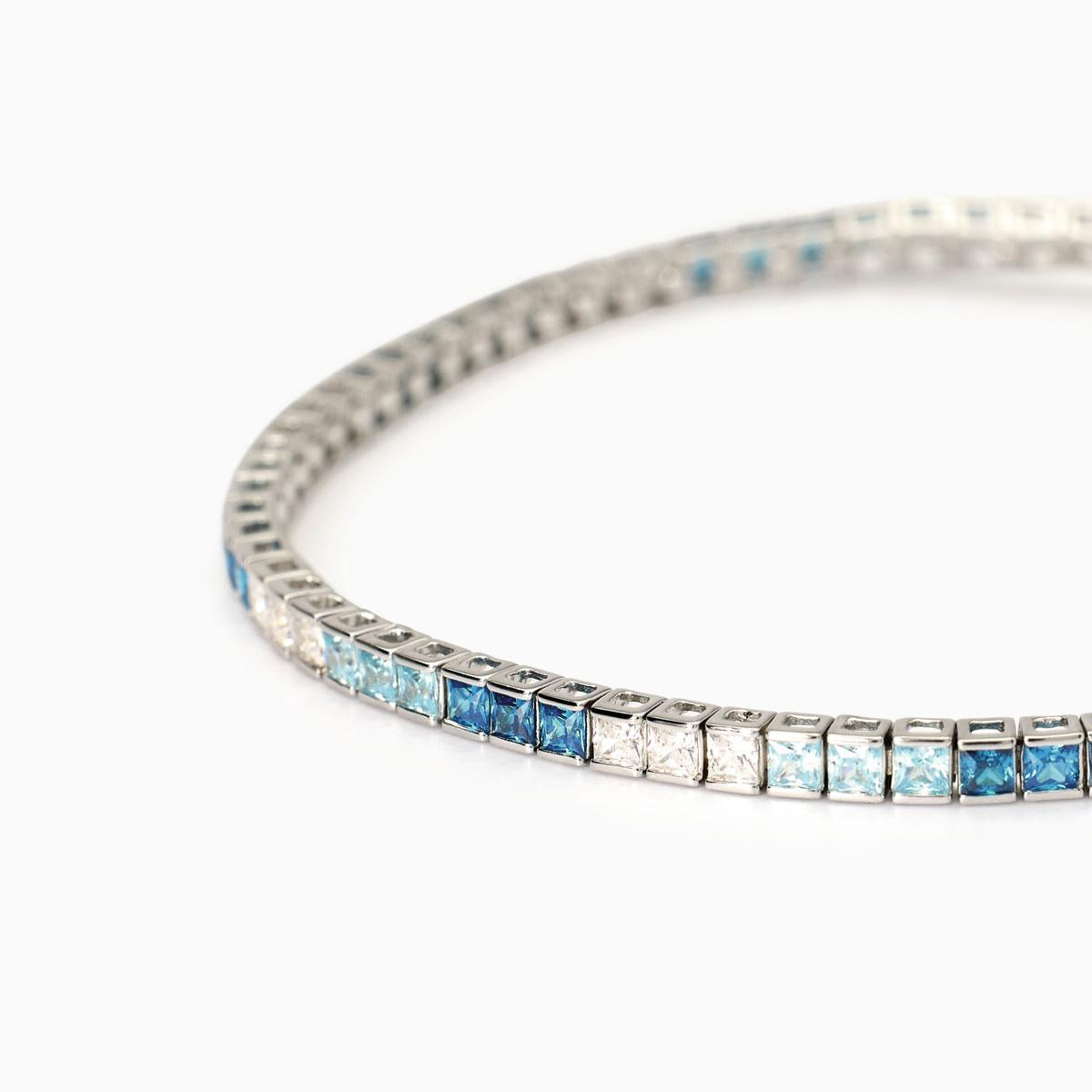Bracciale tennis unisex in argento rodiato con zirconi multicolor sui toni dell'azzurro taglio princess.