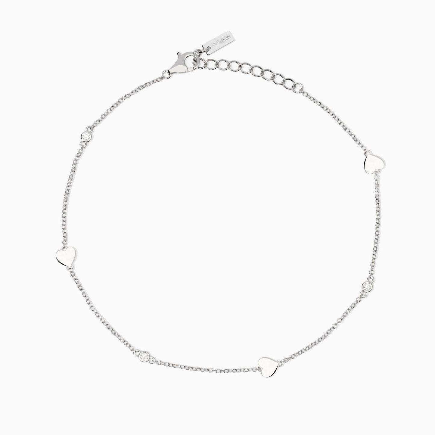 Cavigliera regolabile in argento con catena forzatina, zirconi e cuori.