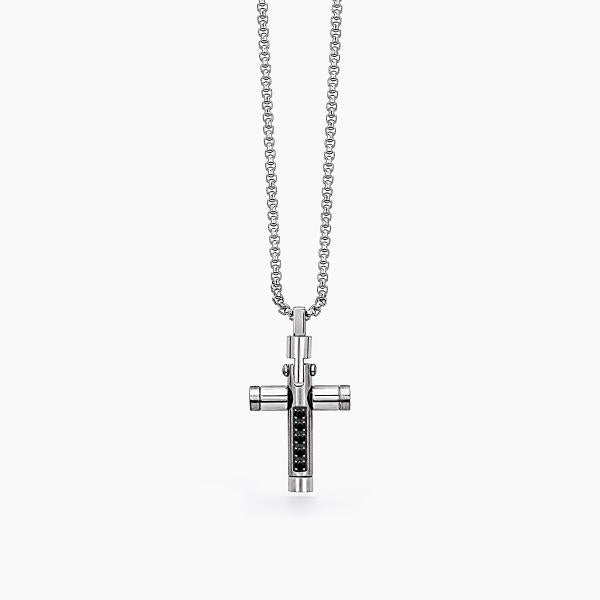 Collana in acciaio 316L con catena veneta 1.5 mm, pendente croce 16x25 mm con PVD nero e cristalli Ø 1 mm, lunghezza 50 cm