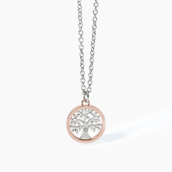 Girocollo in acciaio 316L con catena forzatina 2 mm, pendente in PVD rosé Ø 16 mm con albero della vita e cristallo Ø 1.5 mm, lunghezza 43 cm