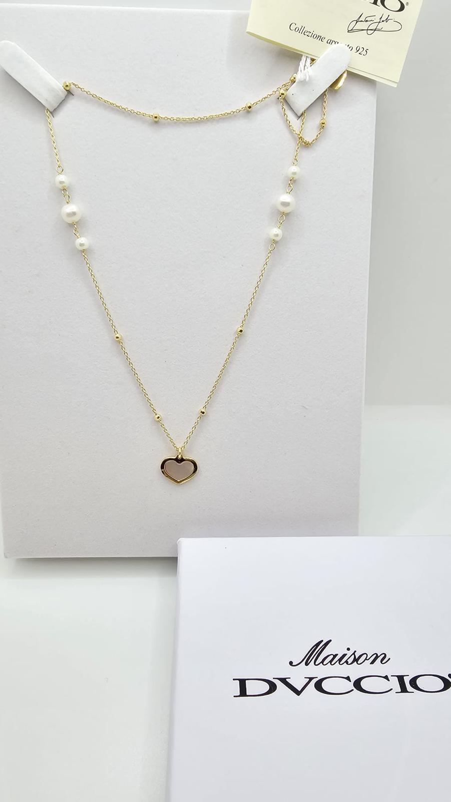 Girocollo in argento 925 con placcatura in oro giallo, cuore in madreperla e perle.
