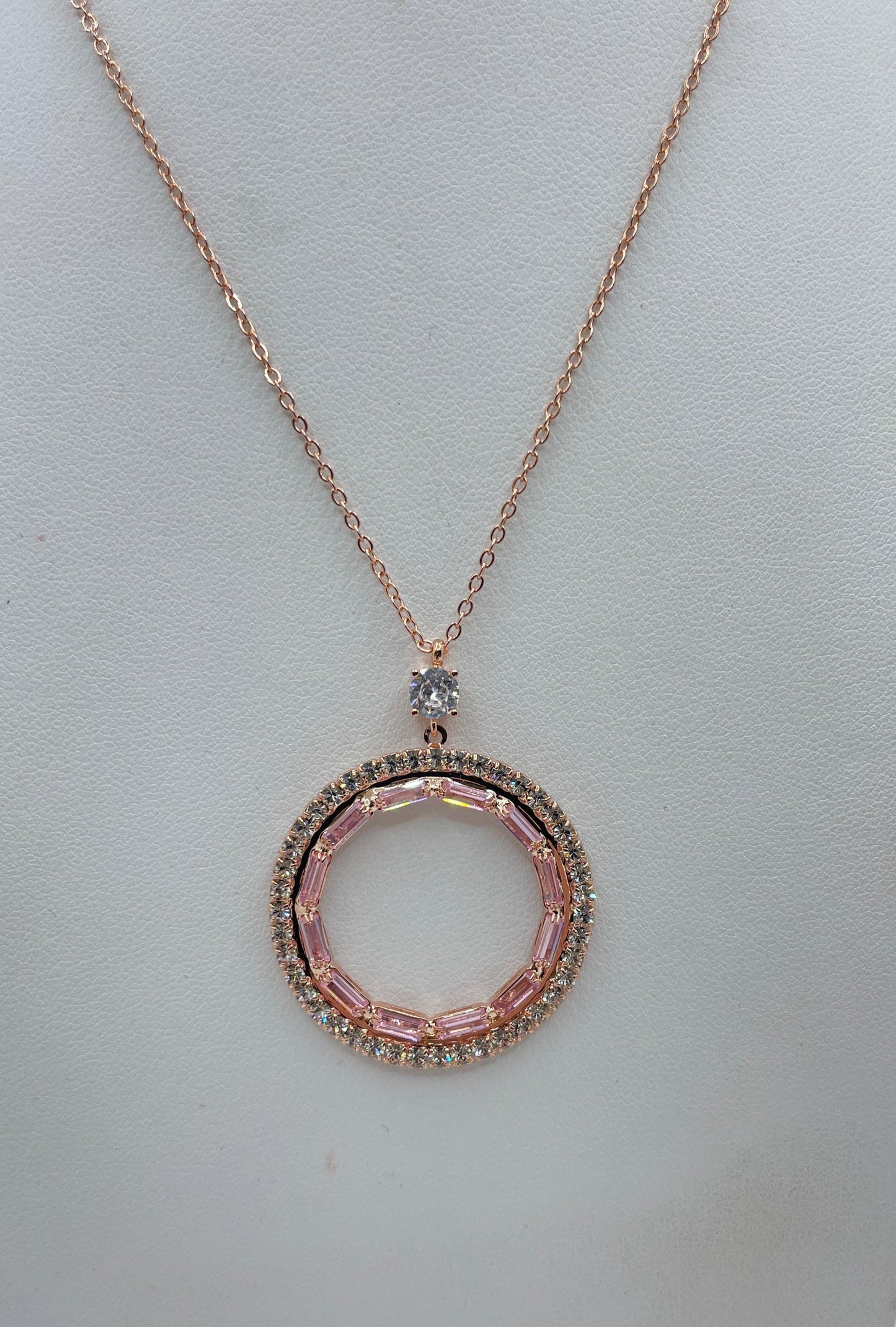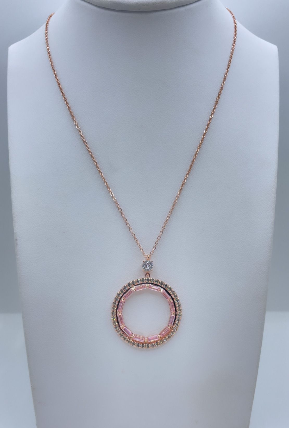 Collana in ottone e acciaio con zirconi e cristalli rosa.