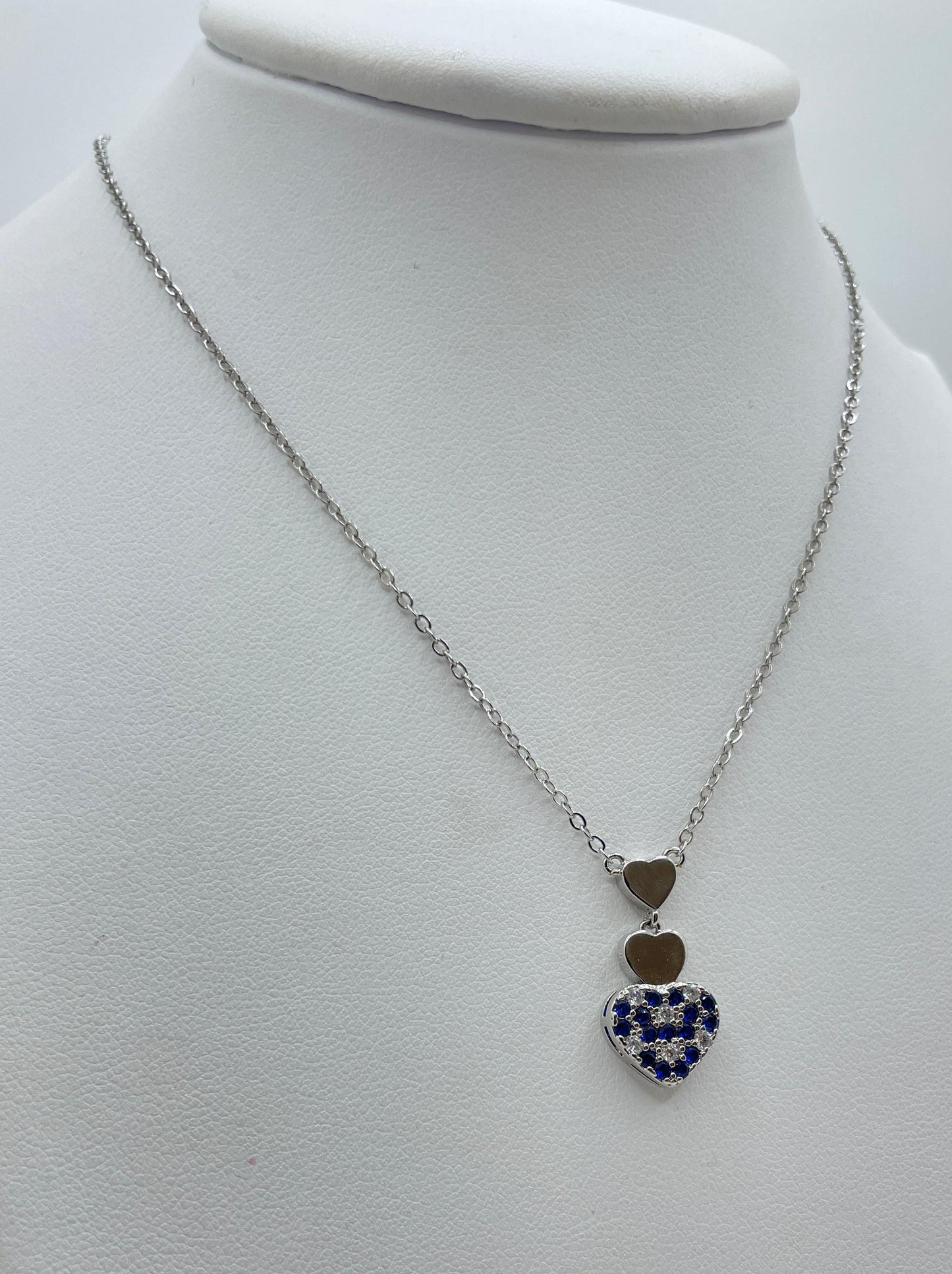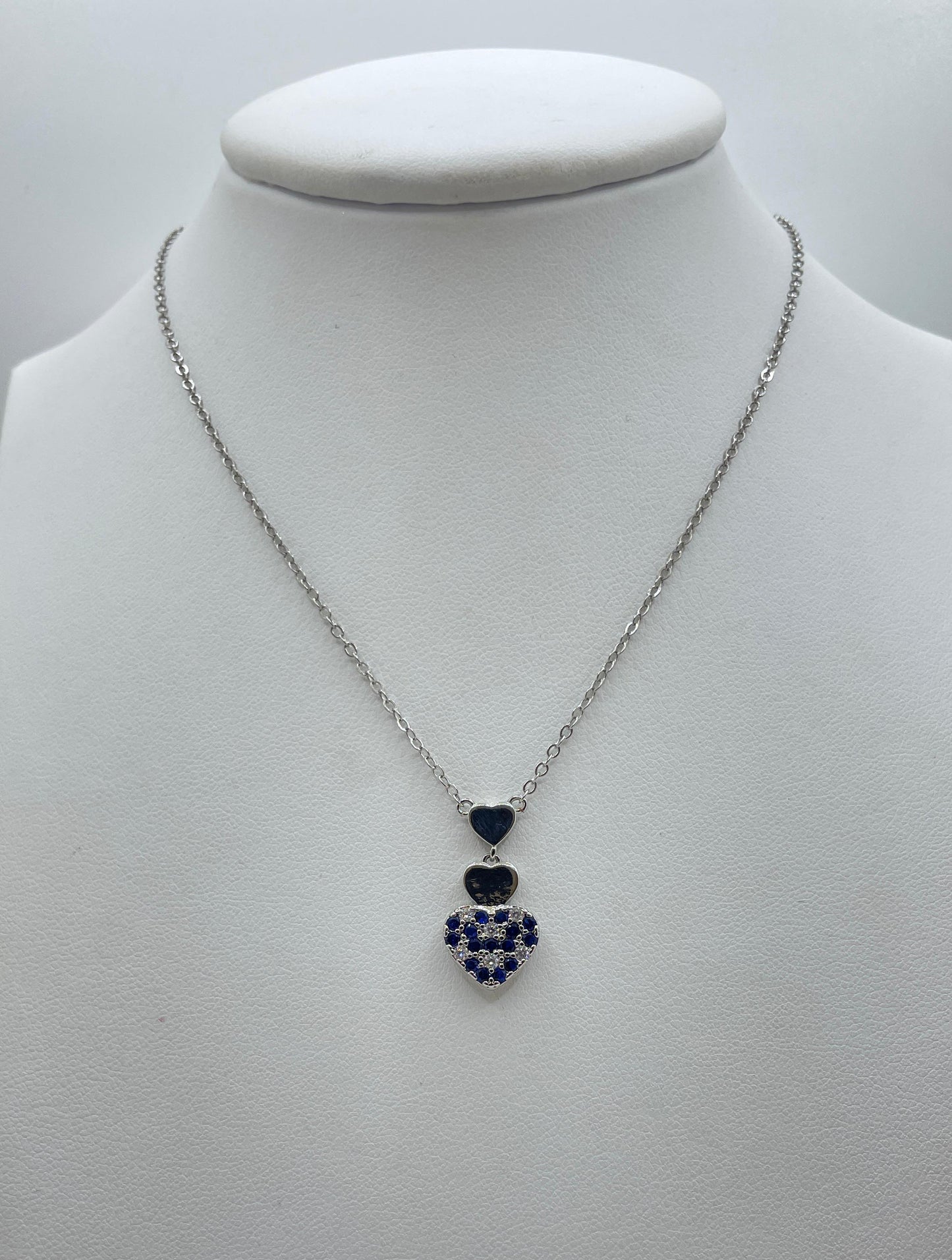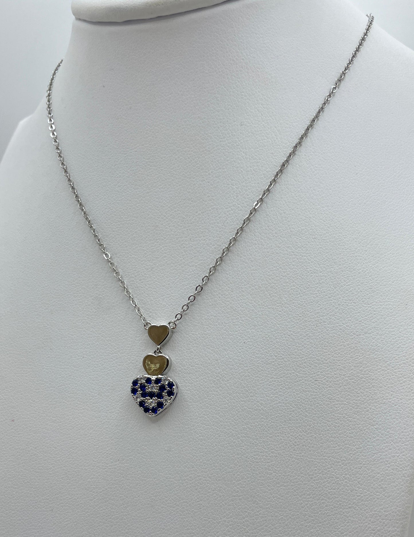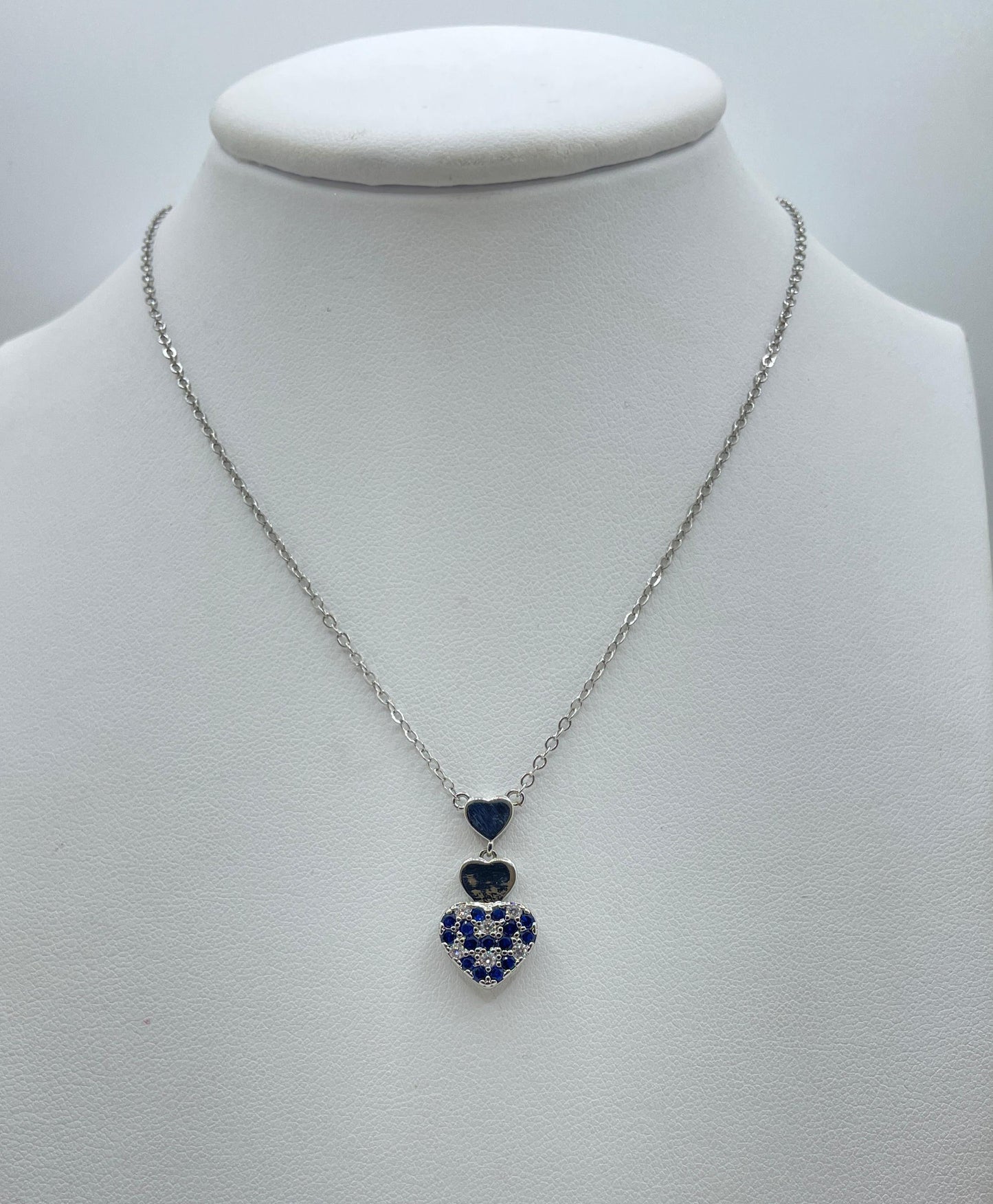 Collana in ottone e acciaio con zirconi bianchi e blu.