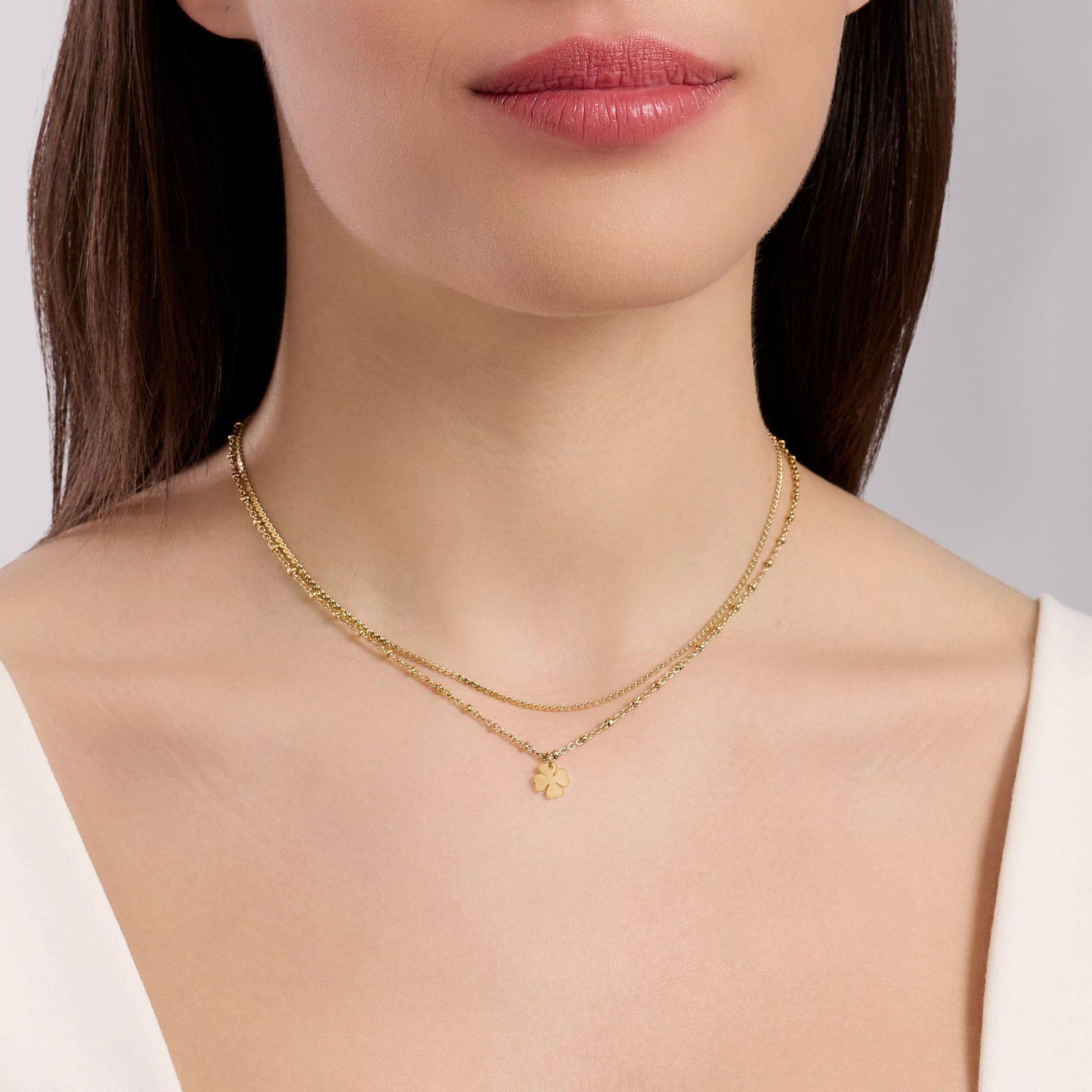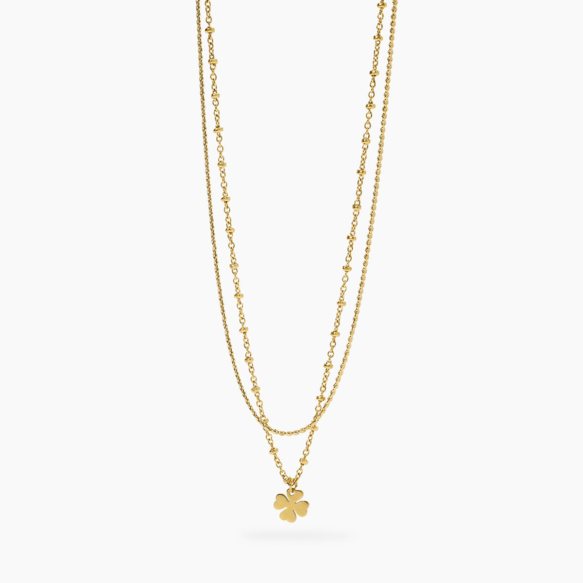 Girocollo regolabile in acciaio dorato con catene rolò e serpentina, e ciondolo quadrifoglio.