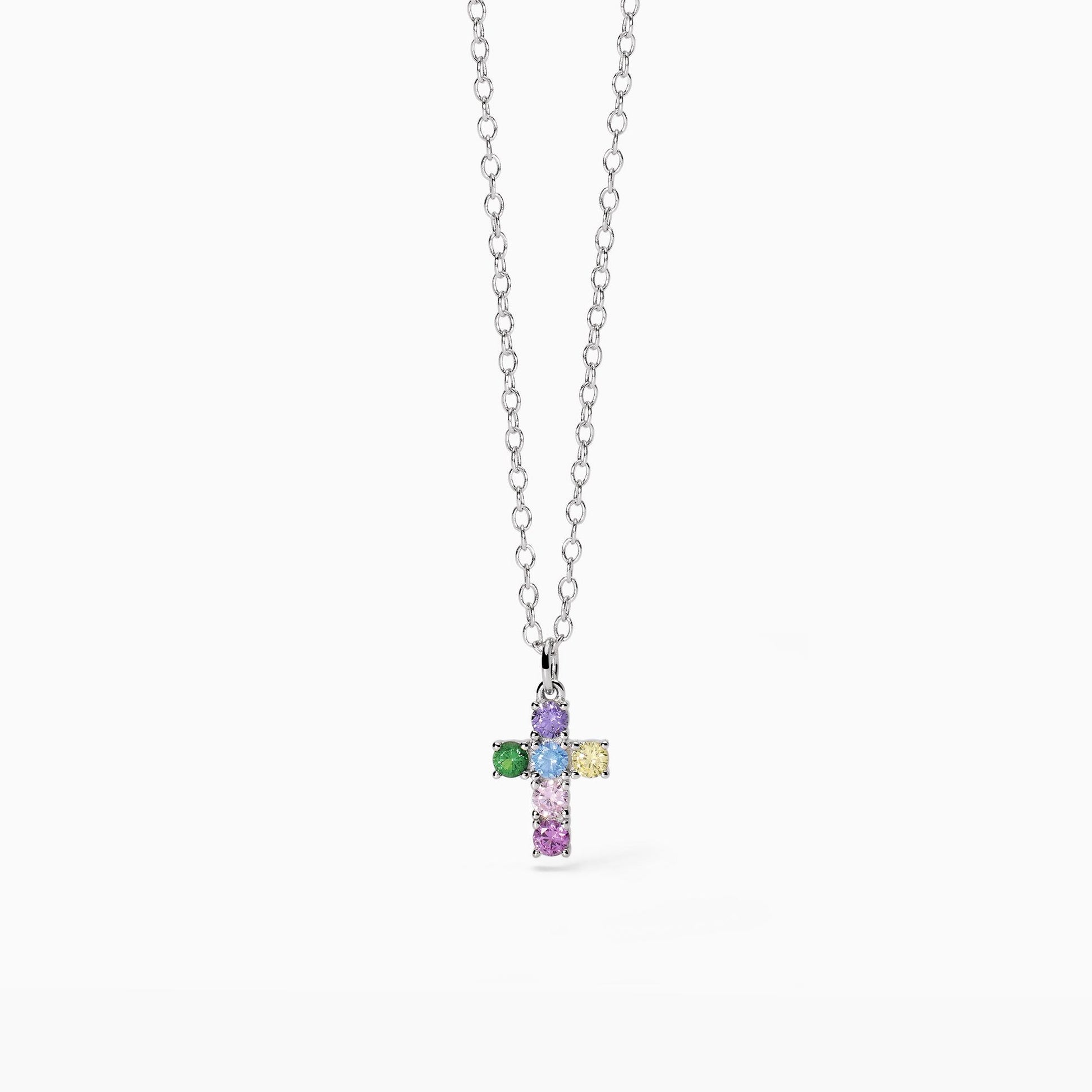 Girocollo regolabile da bambina in argento rodiato con catena forzatina e pendente a forma di croce con tormalina rosa sintetica e zirconi multicolor.
