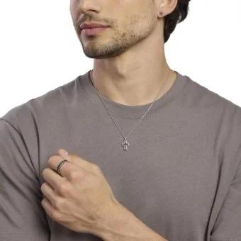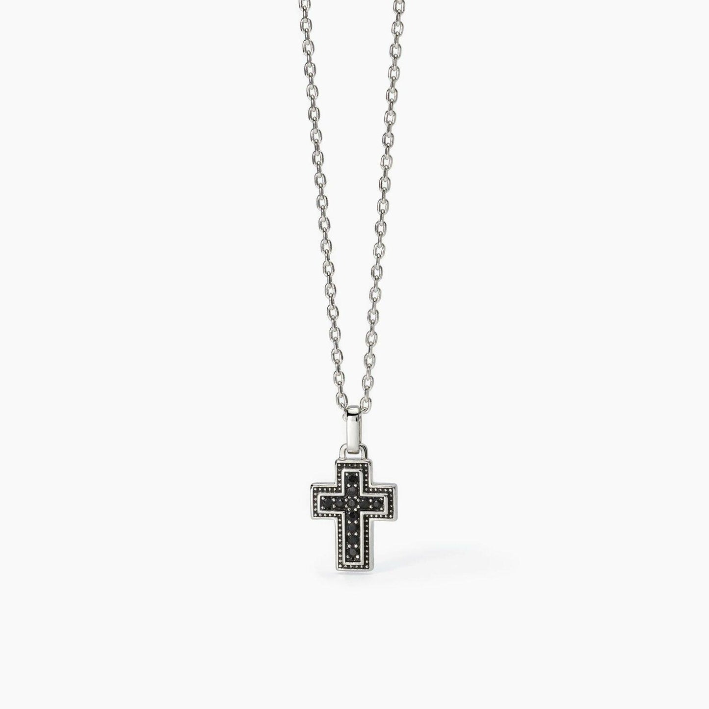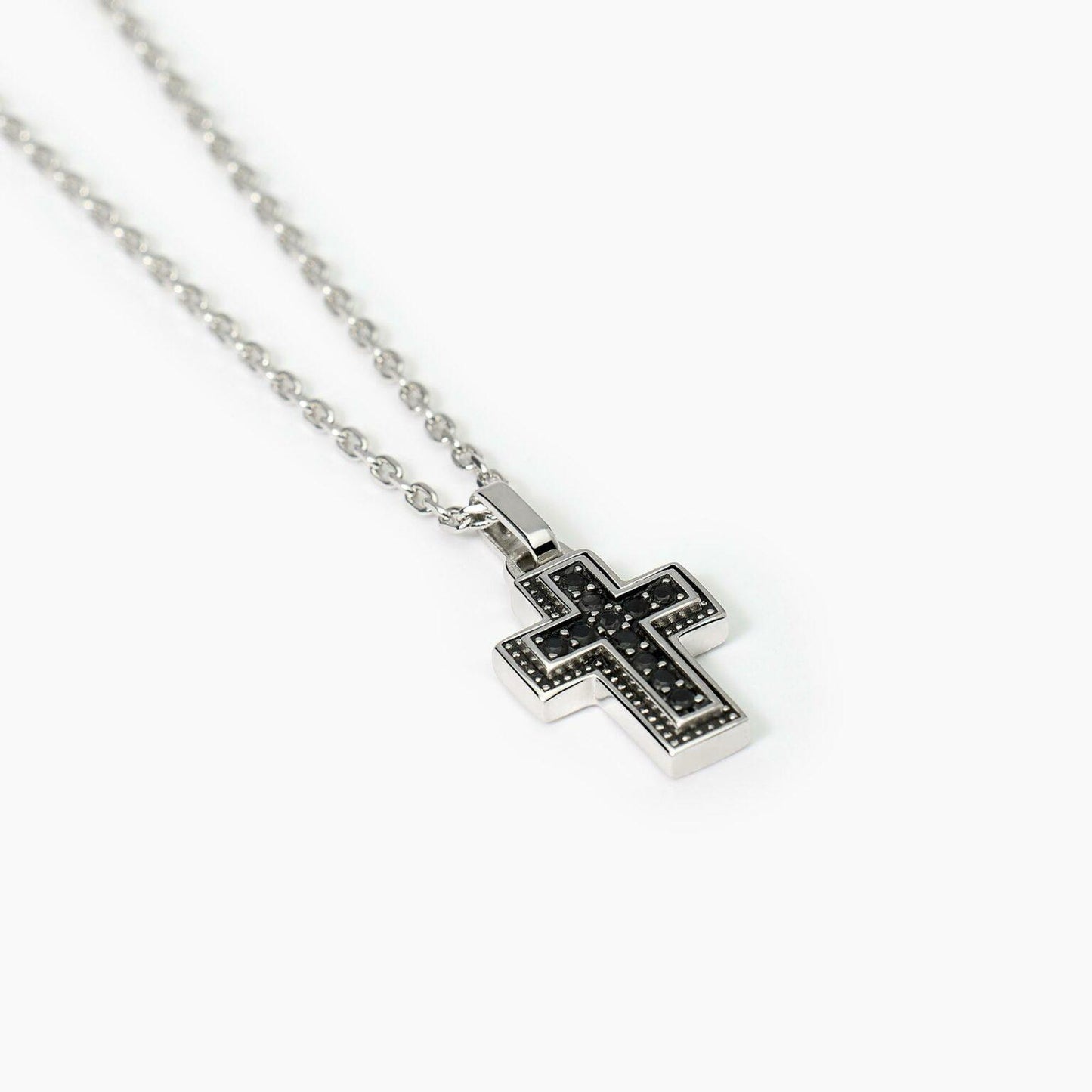 Collana da uomo in argento rodiato con catena forzatina e croce pendente con zirconi neri.