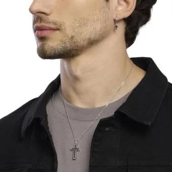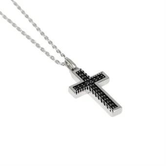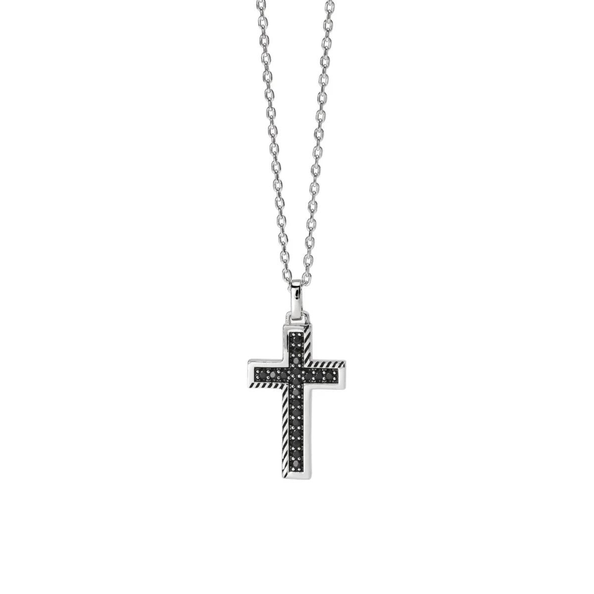 Collana da uomo in argento rodiato con catena forzatina e croce pendente con zirconi neri.