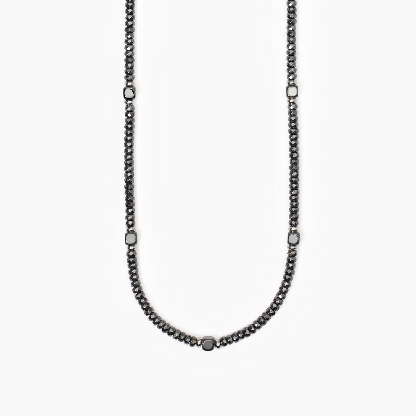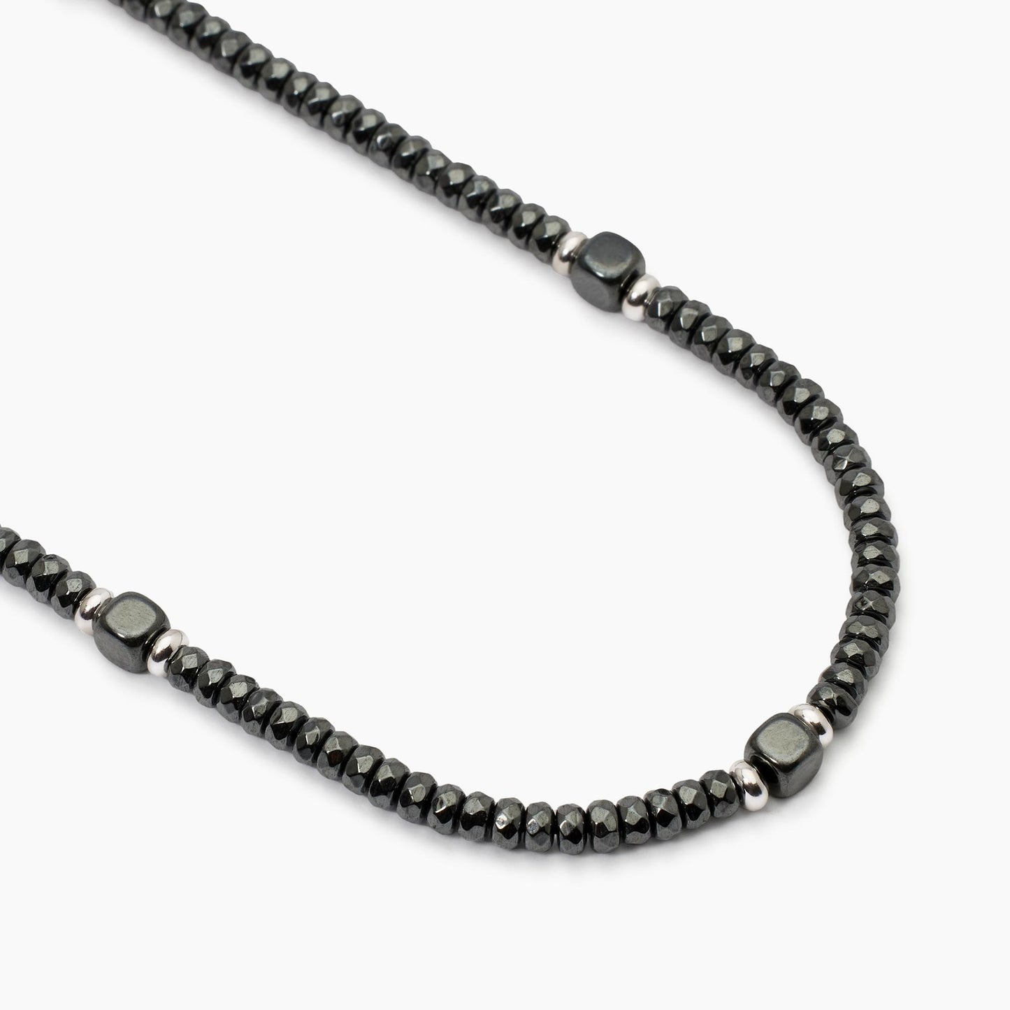 Collana regolabile da uomo in argento rodiato con rondelle faccettate ed elementi di ematite.