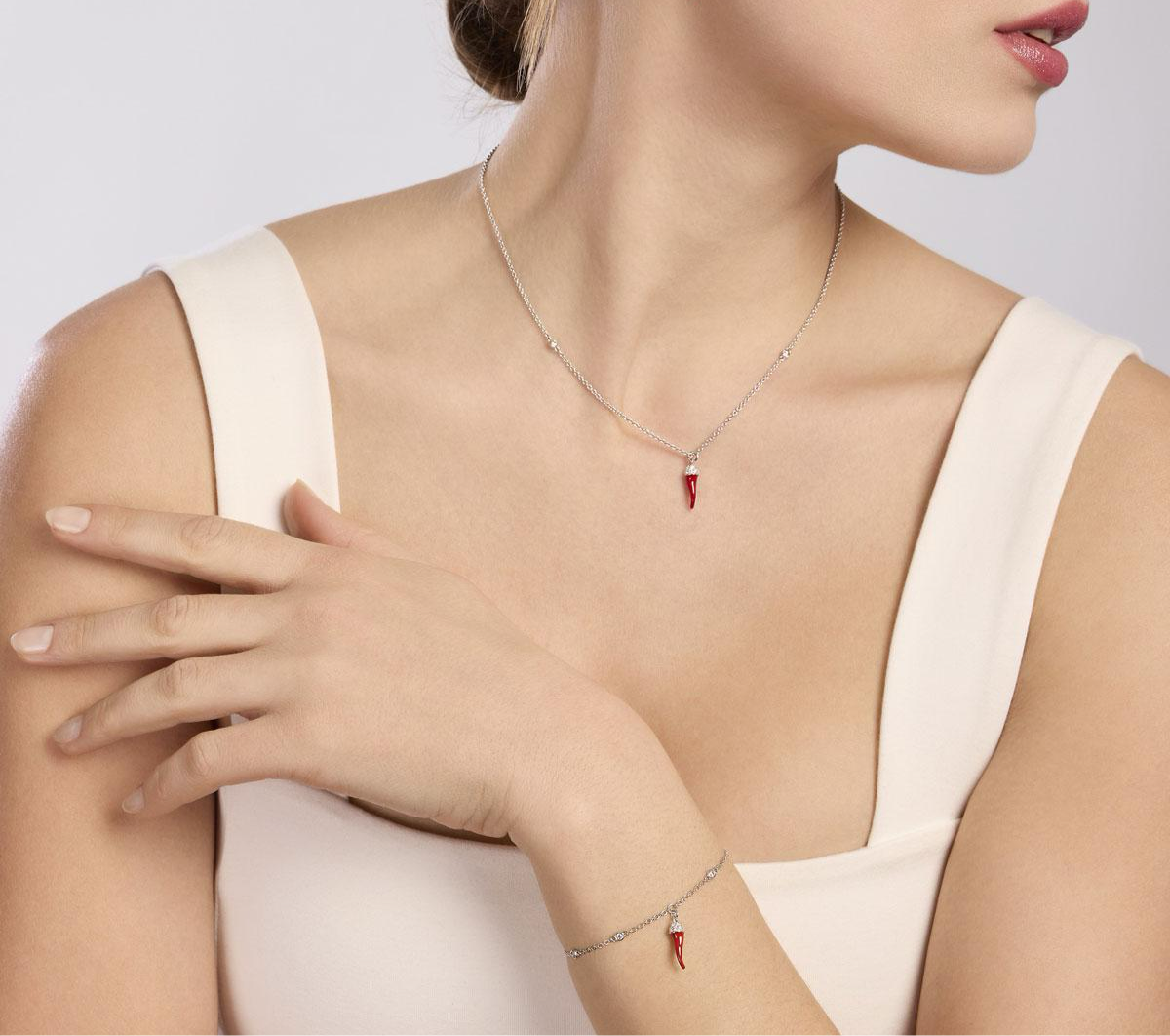 Girocollo regolabile da donna in argento rodiato con catena forzatina e pendente smaltato a forma di cornetto e zirconi.