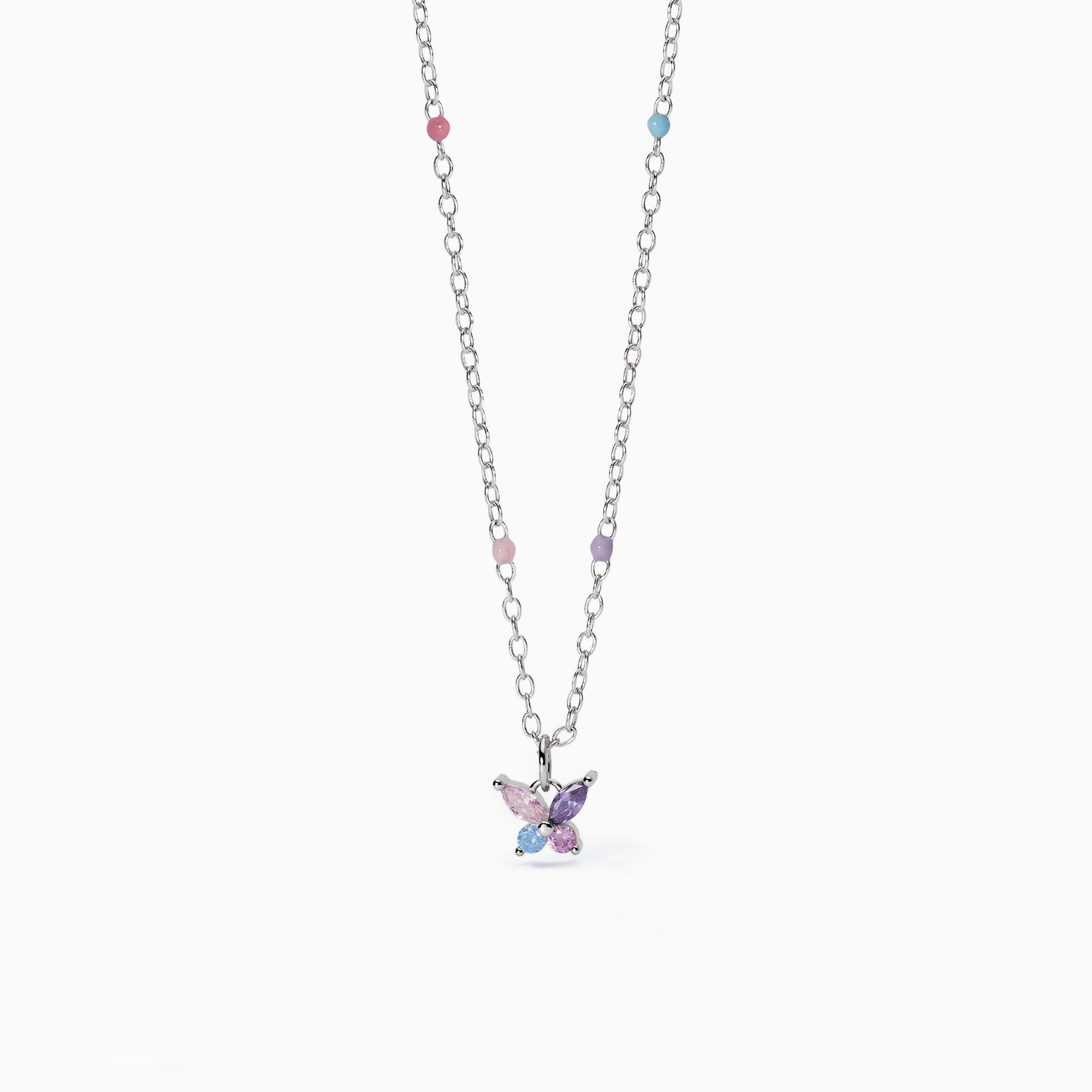 Girocollo regolabile da bambina in argento rodiato con catena forzatina, applicazioni smaltate e pendente a forma di farfalla con tormalina sintetica rosa e zirconi multicolor taglio a navette.