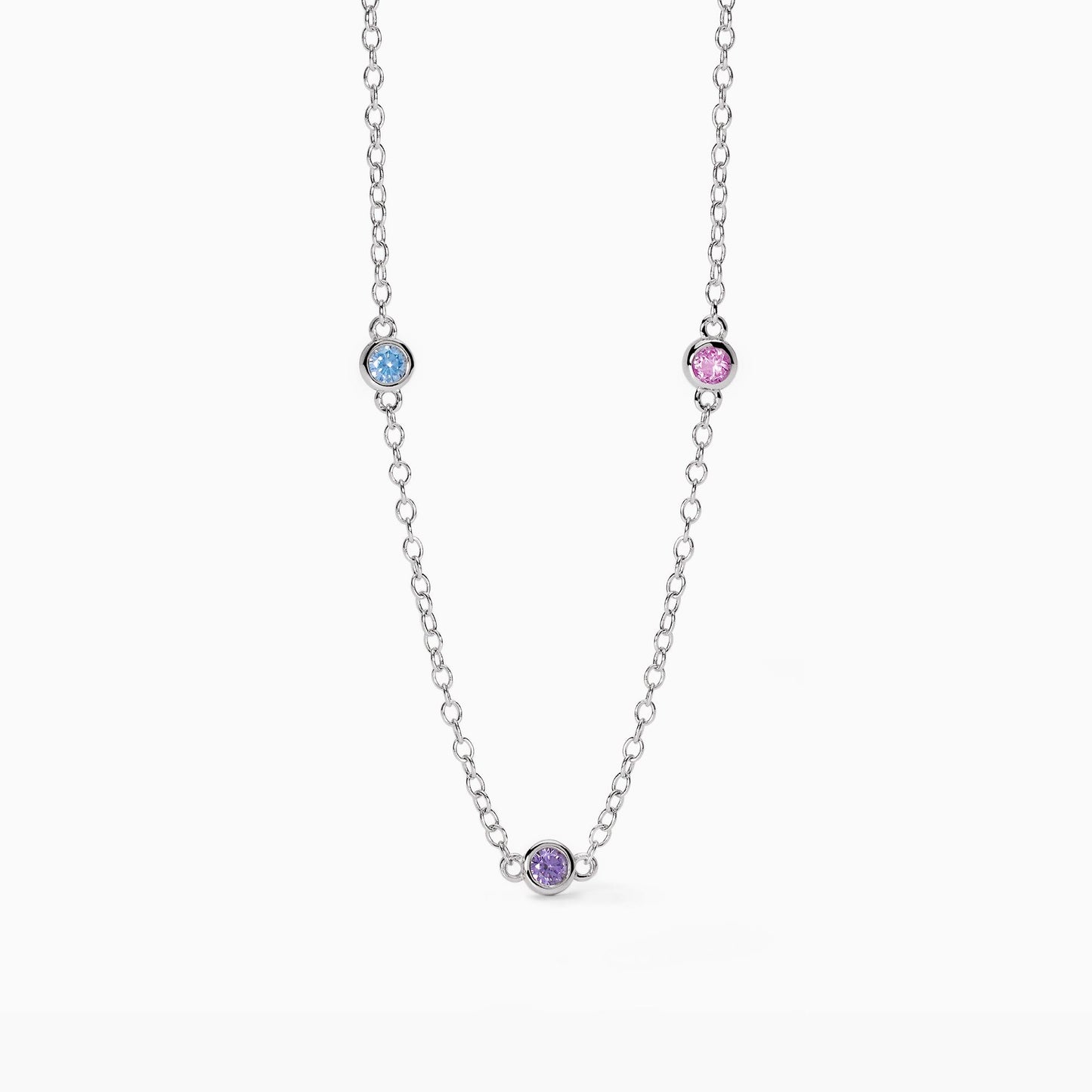 Girocollo regolabile da bambina in argento rodiato con catena forzatina, tormaline rosa sintetiche e zirconi multicolor.