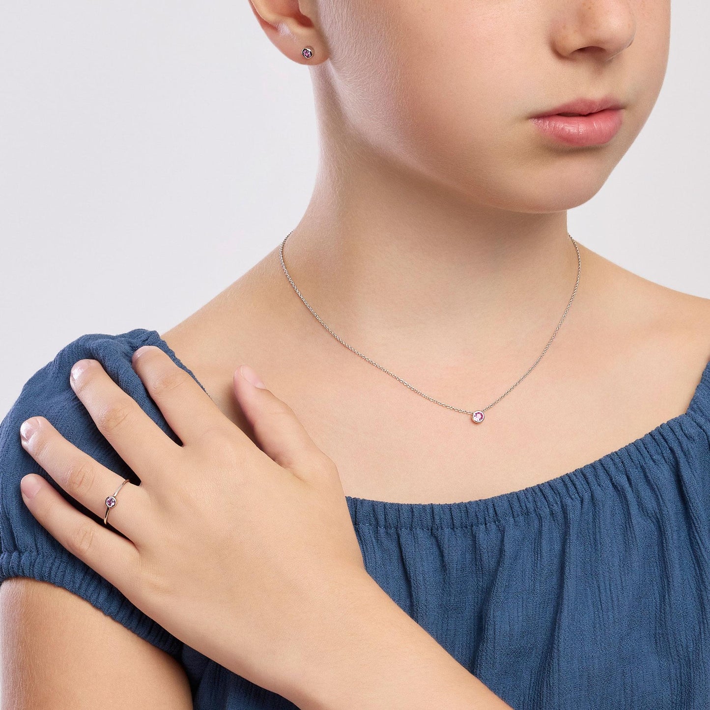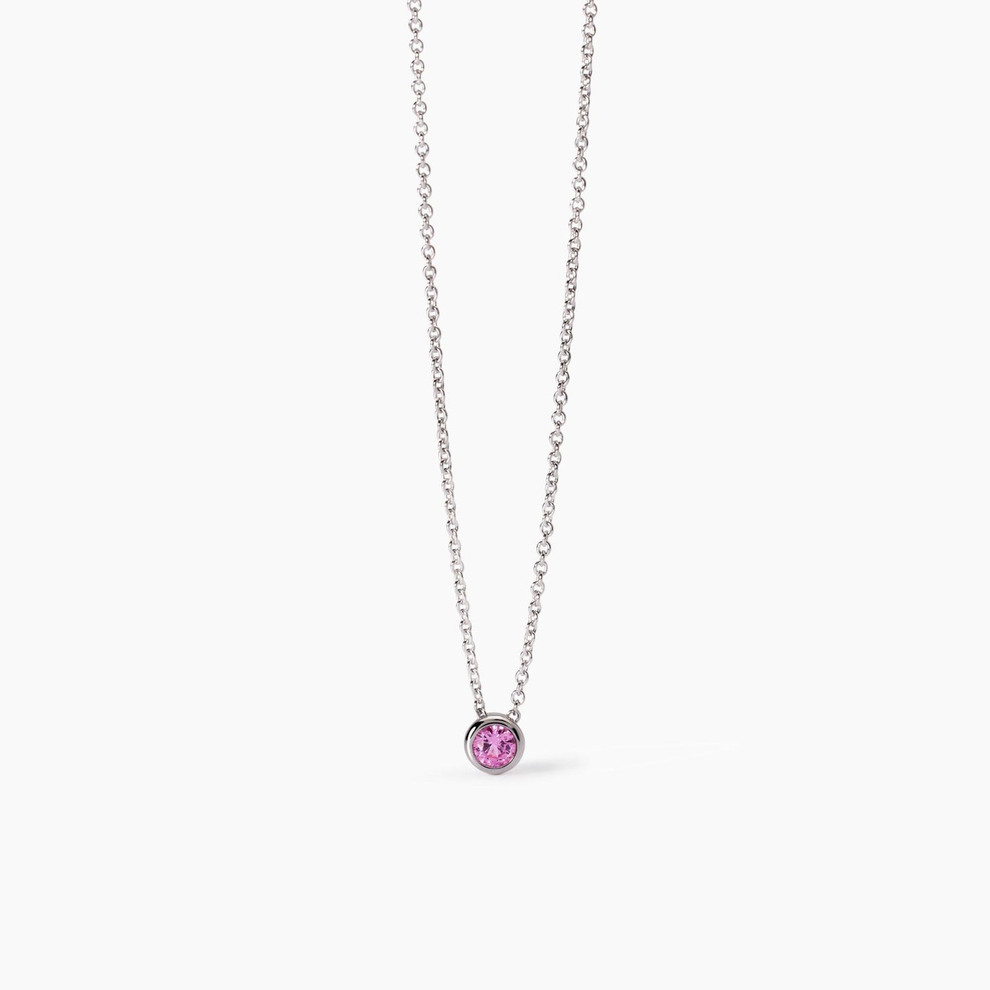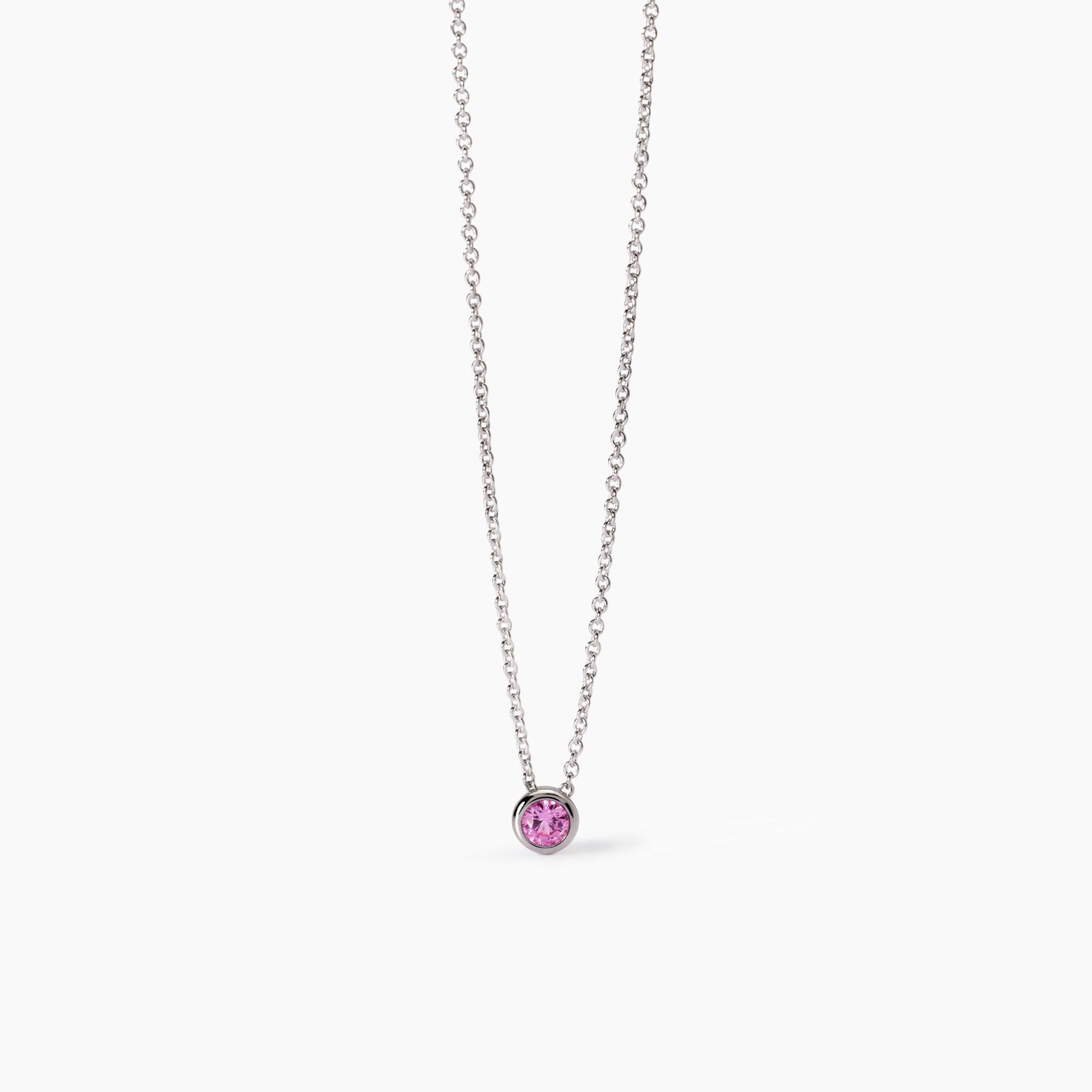 Girocollo regolabile da bambina in argento rodiato con catena rolò e pendente rotondo con corindone rosa sintetico.