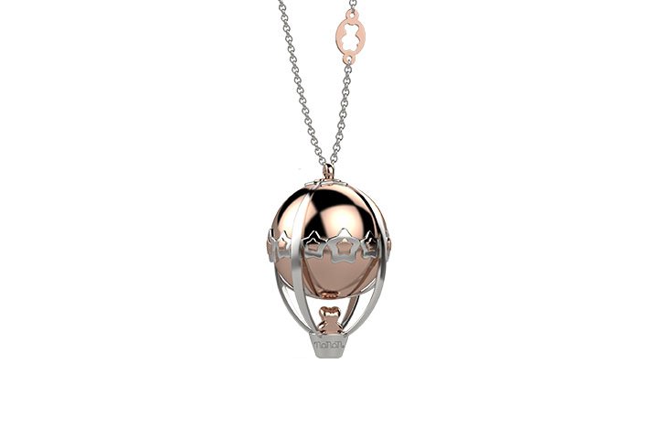 Pendente a mongolfiera in puro argento 925. Con il suo design rifinito ed elegante, il chiama angeli accompagna la mamma nei mesi più dolci.