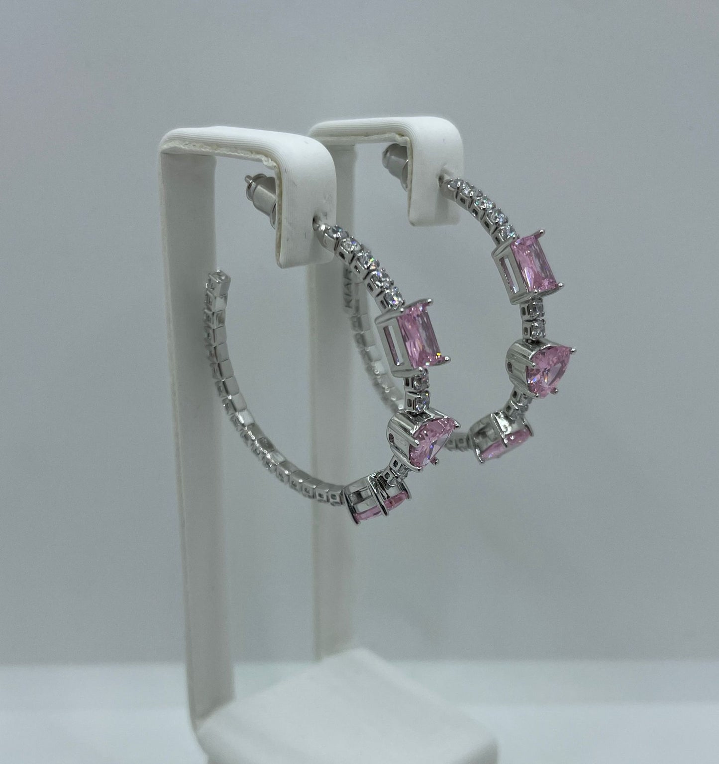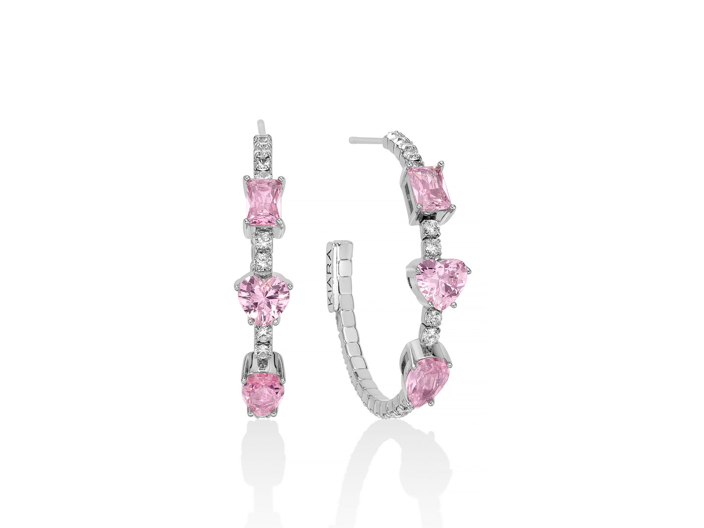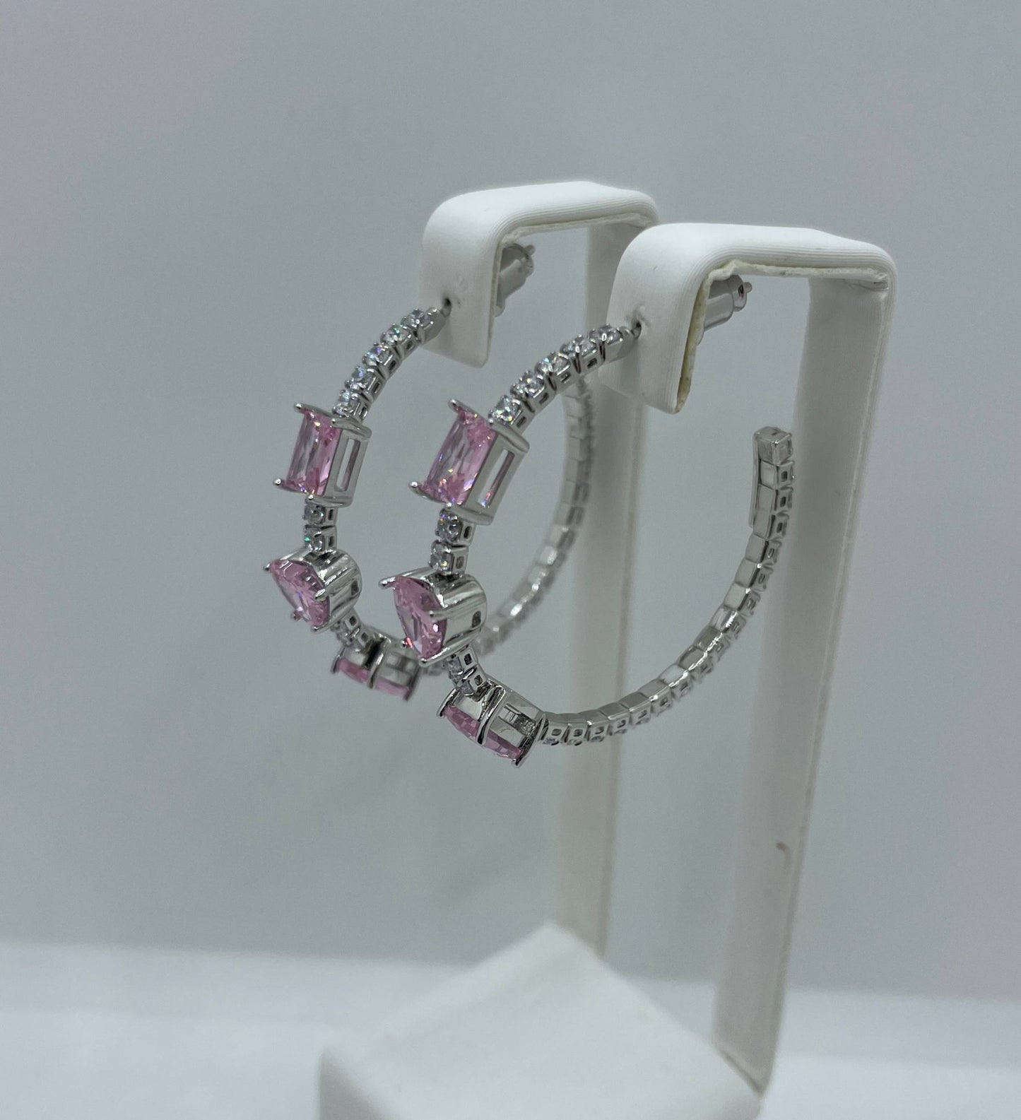 Orecchini in ottone/acciaio con zirconi e cristalli rosa.