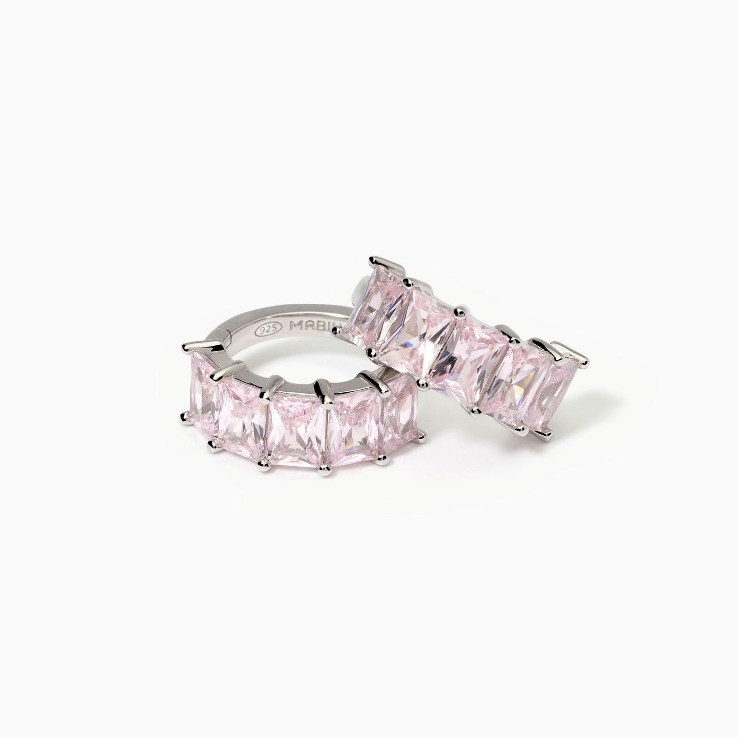Orecchini a cerchio da donna in argento rodiato con zirconi rosa taglio baguette.