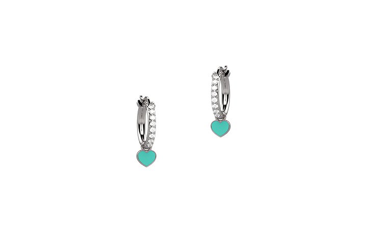 Graziosa coppia di orecchini a cerchio in argento 925, impreziositi da zirconi e con uno charm a forma di piccolo cuore, laccato con vernice turchese.