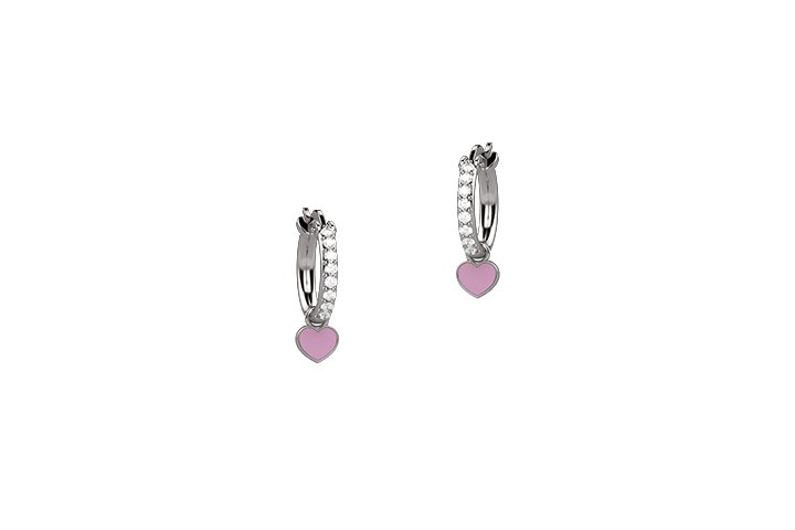 Graziosa coppia di orecchini a cerchio in argento 925, impreziositi da zirconi e con uno charm a forma di piccolo cuore, laccato con vernice rosa.
