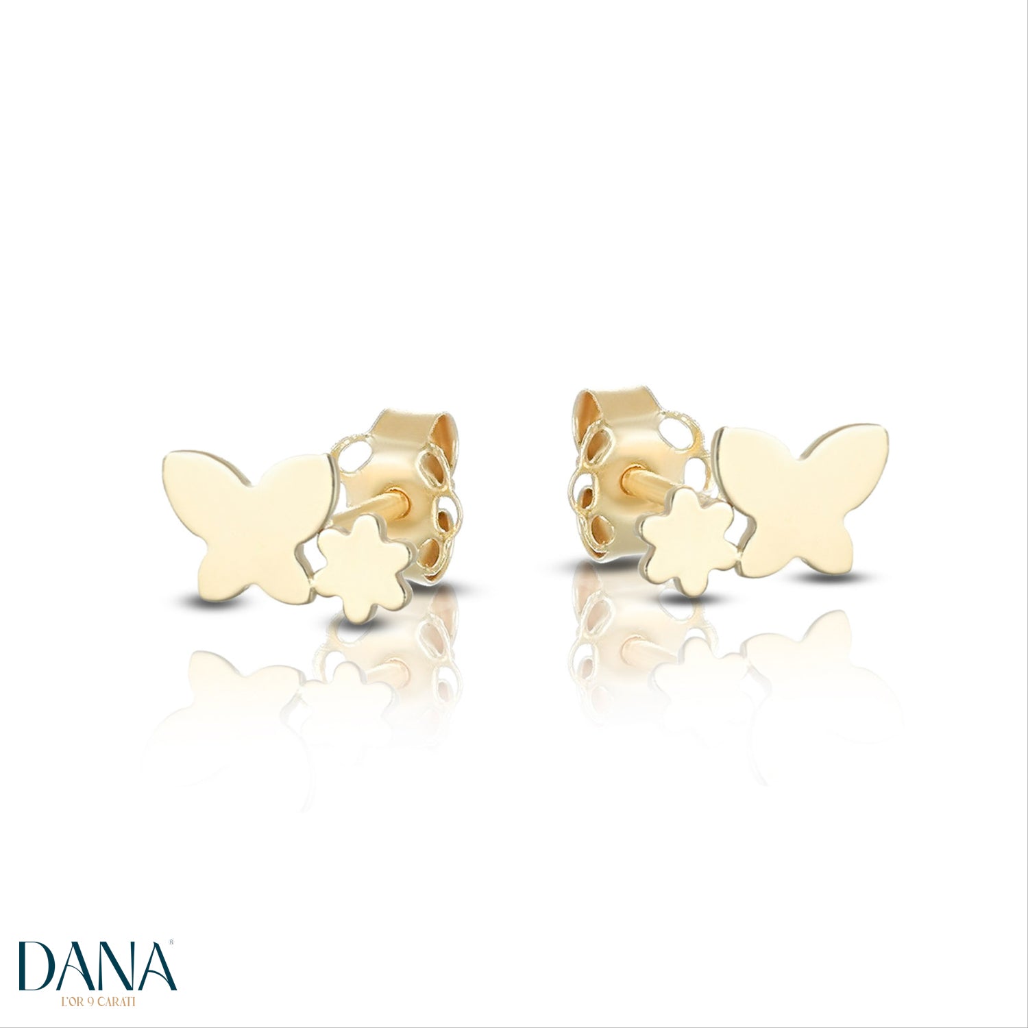 Orecchini in oro giallo 9kt con farfalla e fiore.