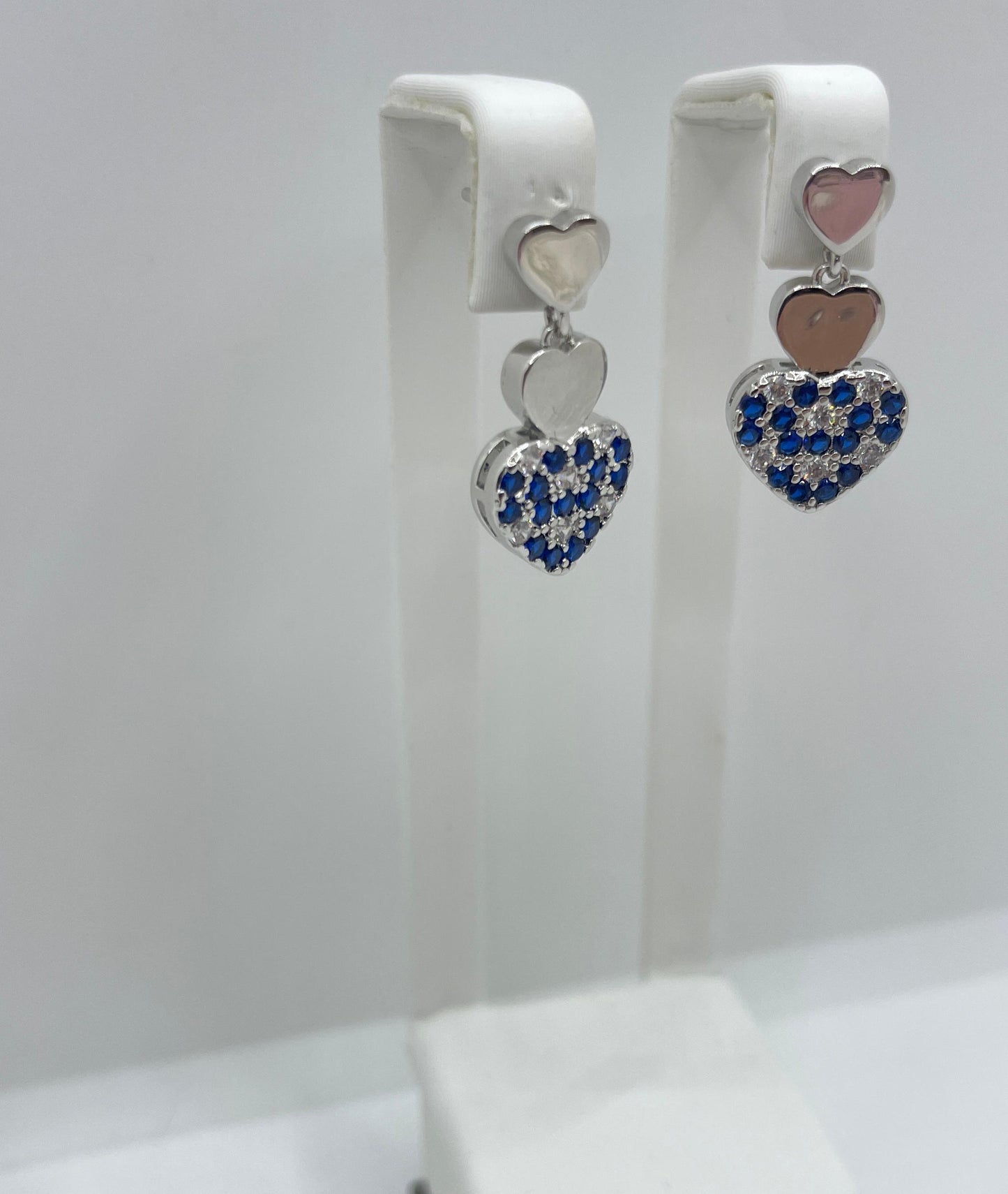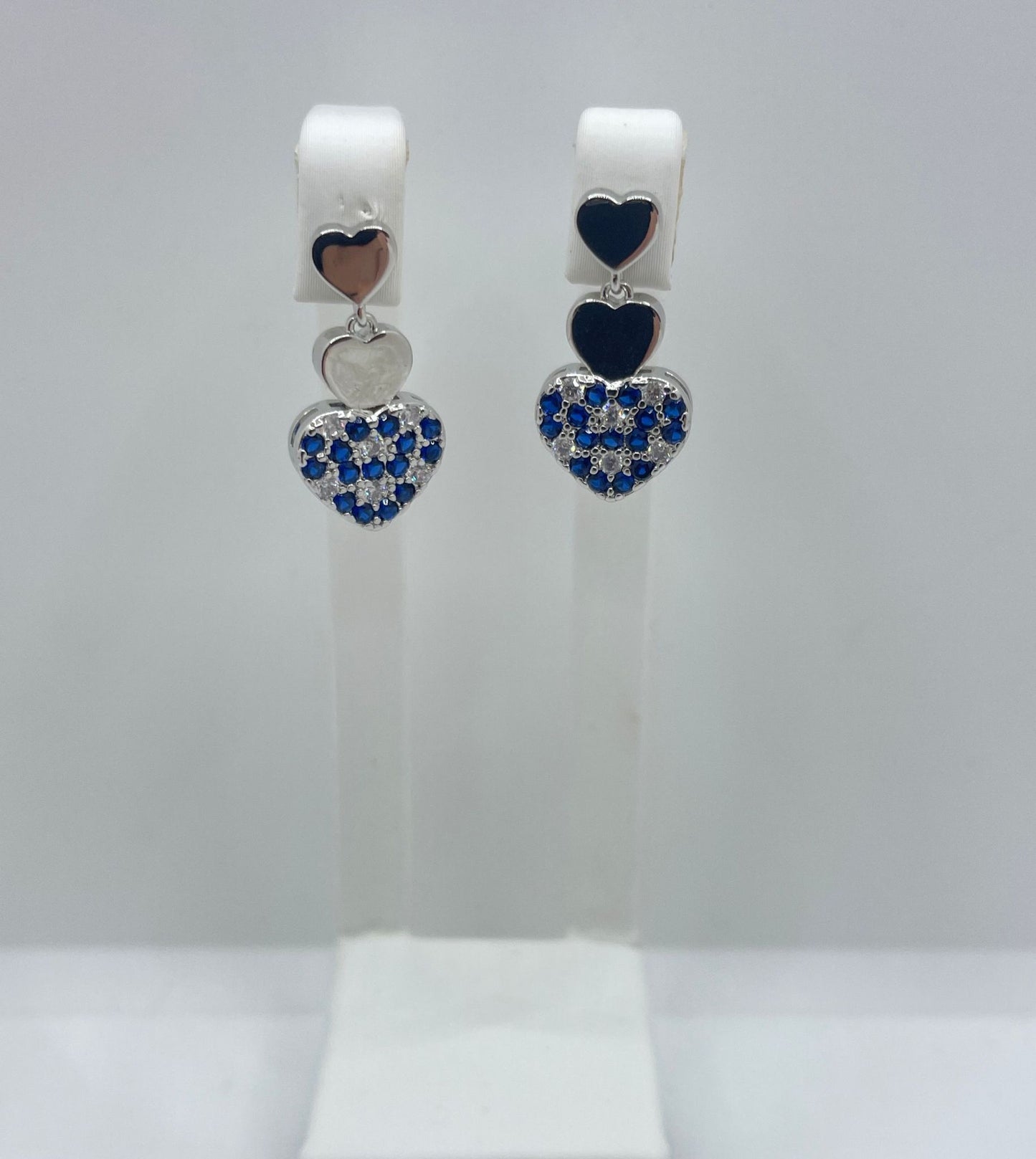 Orecchini in ottone e acciaio con zirconi bianchi e blu.