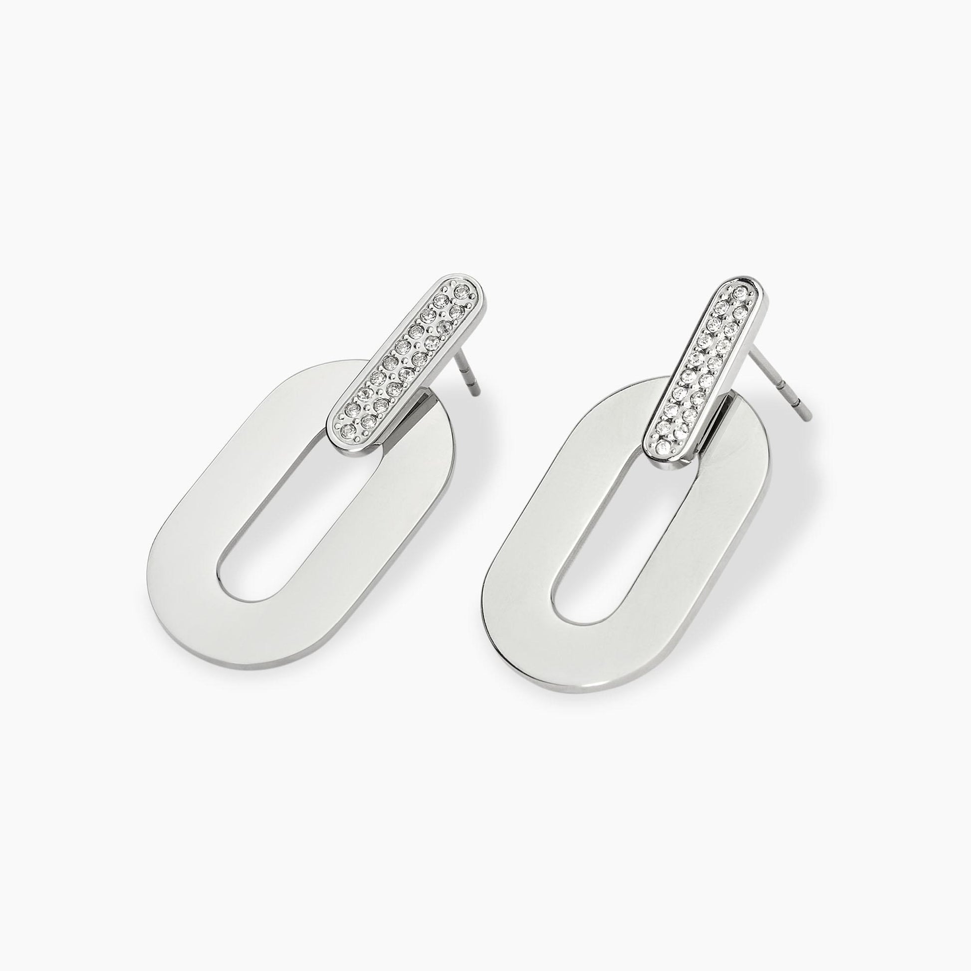 Orecchini in acciaio con cristalli e pendenti allungati.
