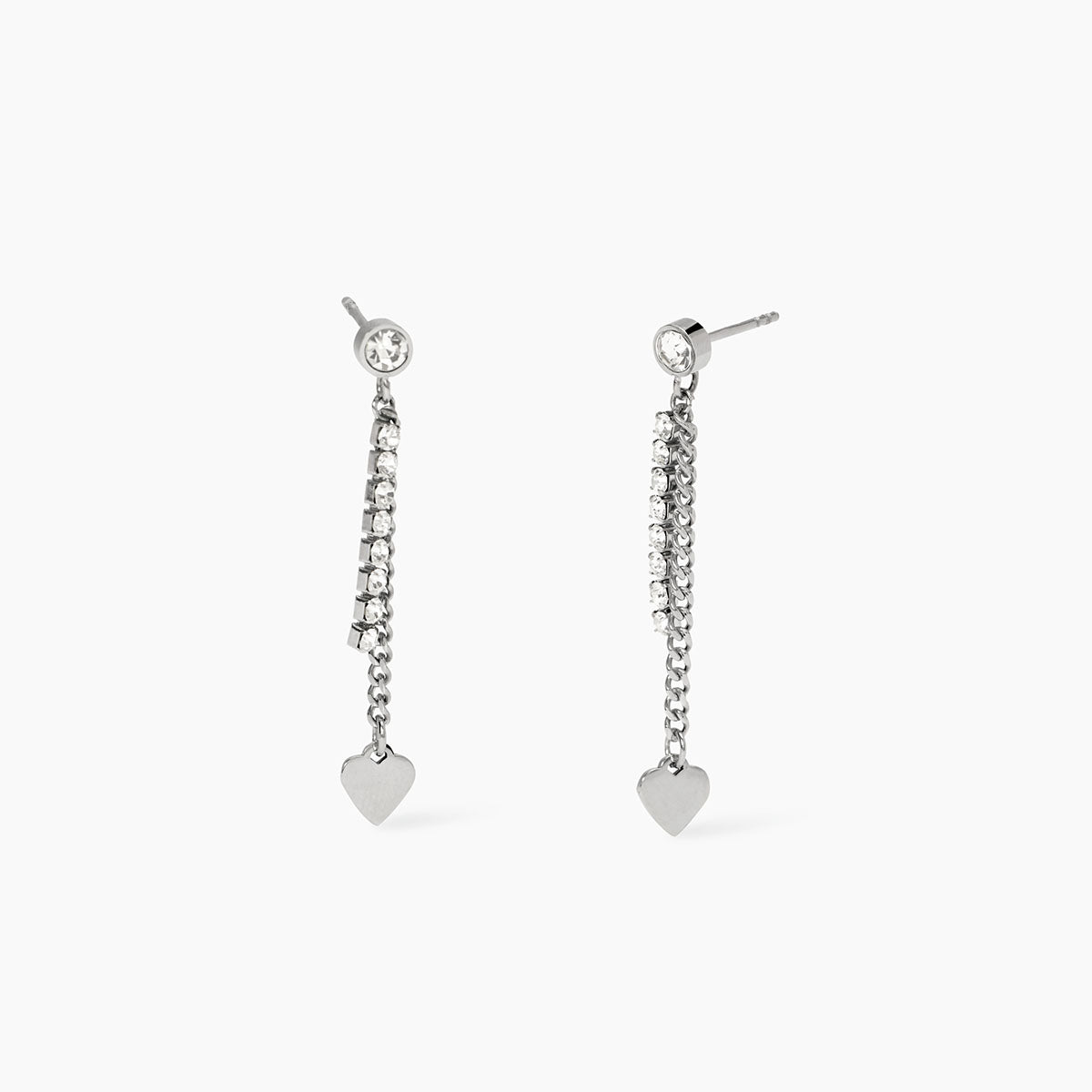 Orecchini in acciaio con cristallo e pendenti con catene groumette e cristalli con cuore.