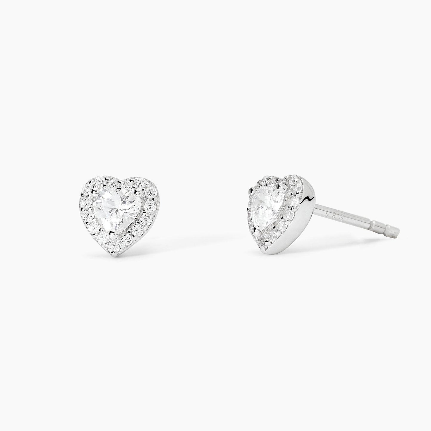 Orecchini da donna a lobo in argento rodiato a forma di cuore con zirconi bianchi.