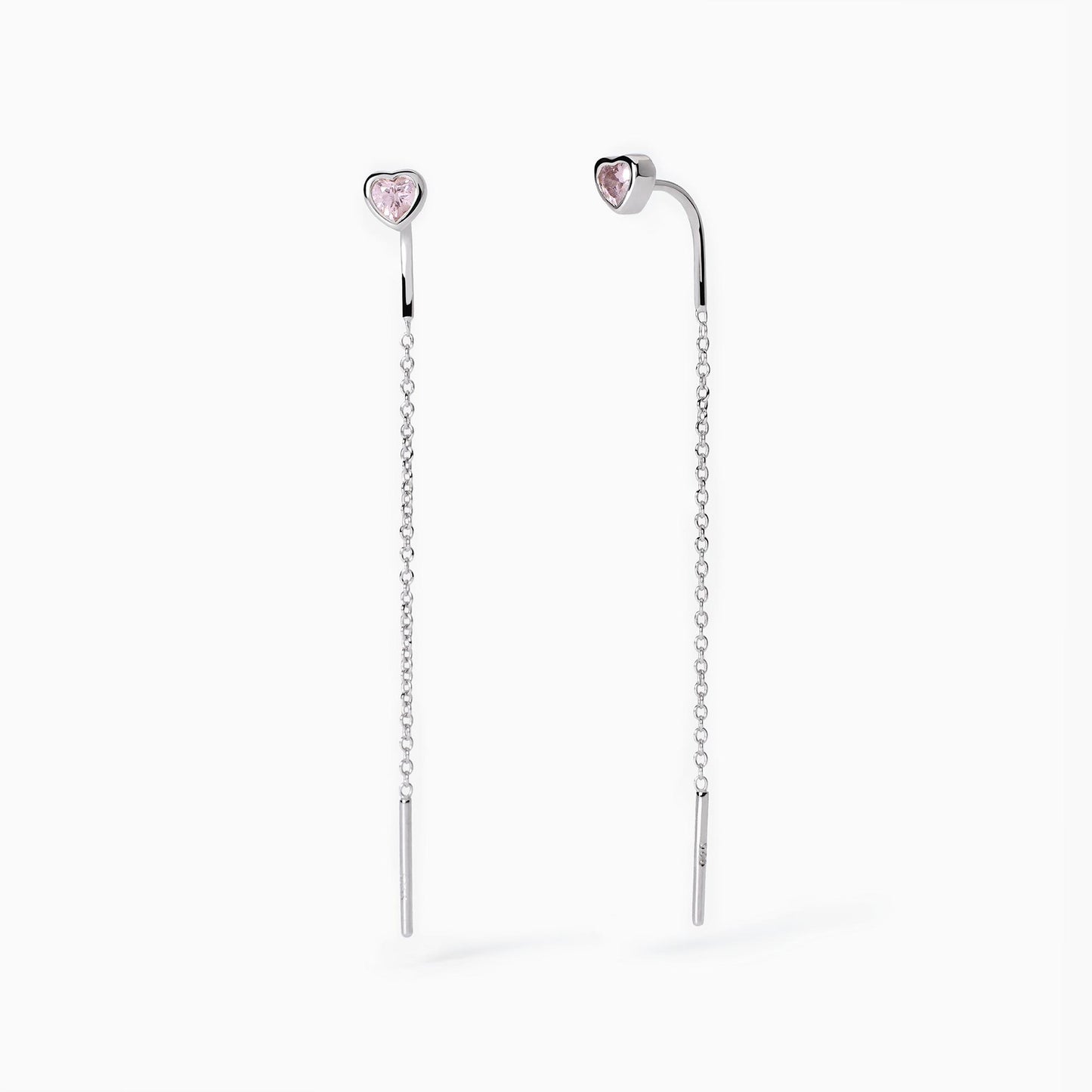 Orecchini da bambina in argento rodiato con catena forzatina e zirconi rosa taglio cuore.