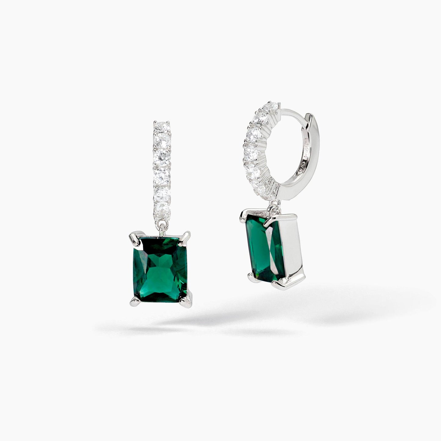Orecchini da donna in argento rodiato a cerchio con zirconi e smeraldi sintetici pendenti taglio princess.