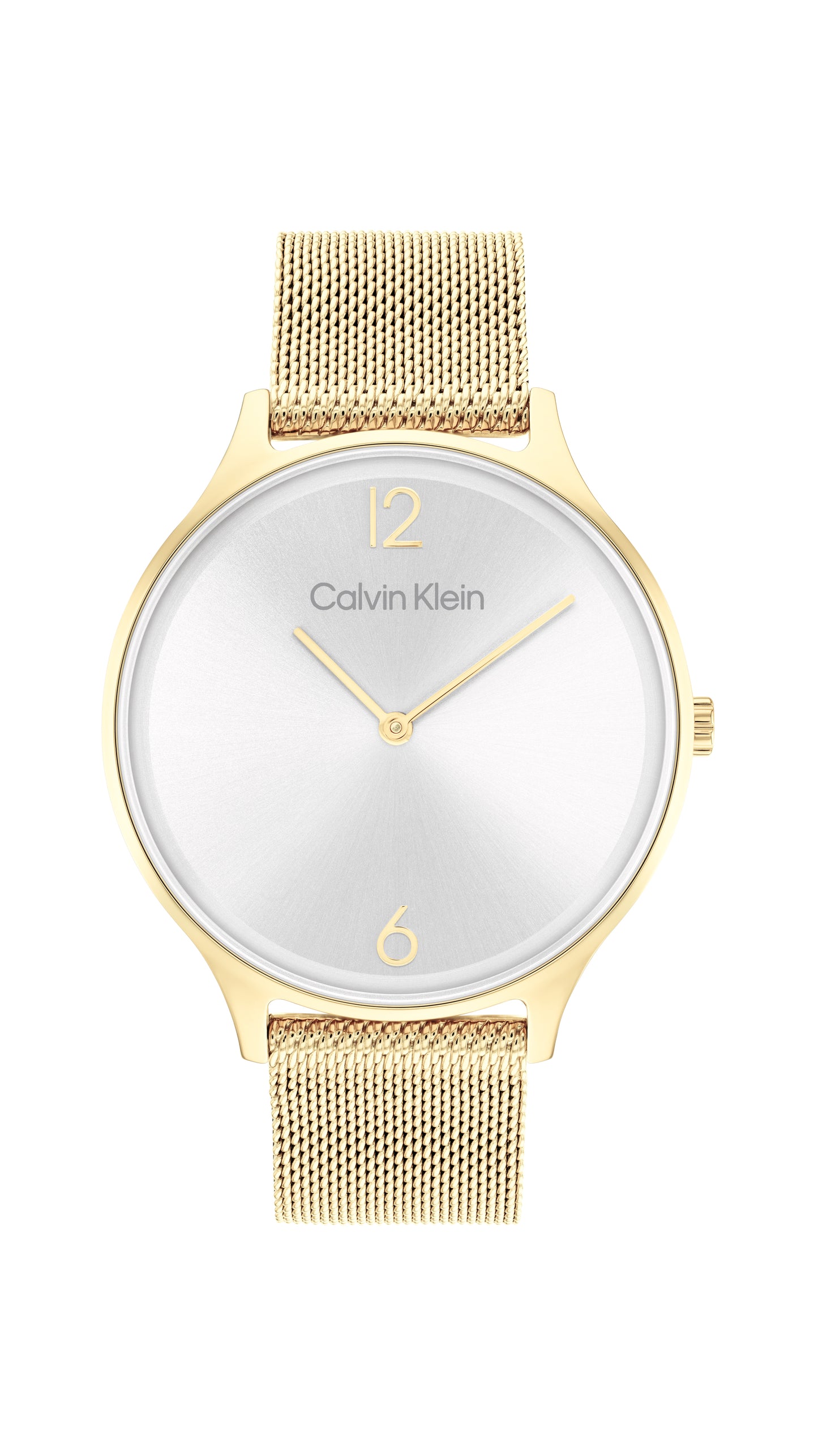 Orologio solo tempo a due lancette da donna di Calvin Klein della collezione timeless. La cassa è in acciaio inossidabile di colore oro, di forma rotonda, con diametro di 38 mm. Il bracciale è in acciaio inossidabile di colore oro. Il quadrante è di colore argento. Il vetro è minerale. Gli indici sono con numeri arabi. Il movimento è al quarzo. La resistenza all'acqua è di 3 atm.