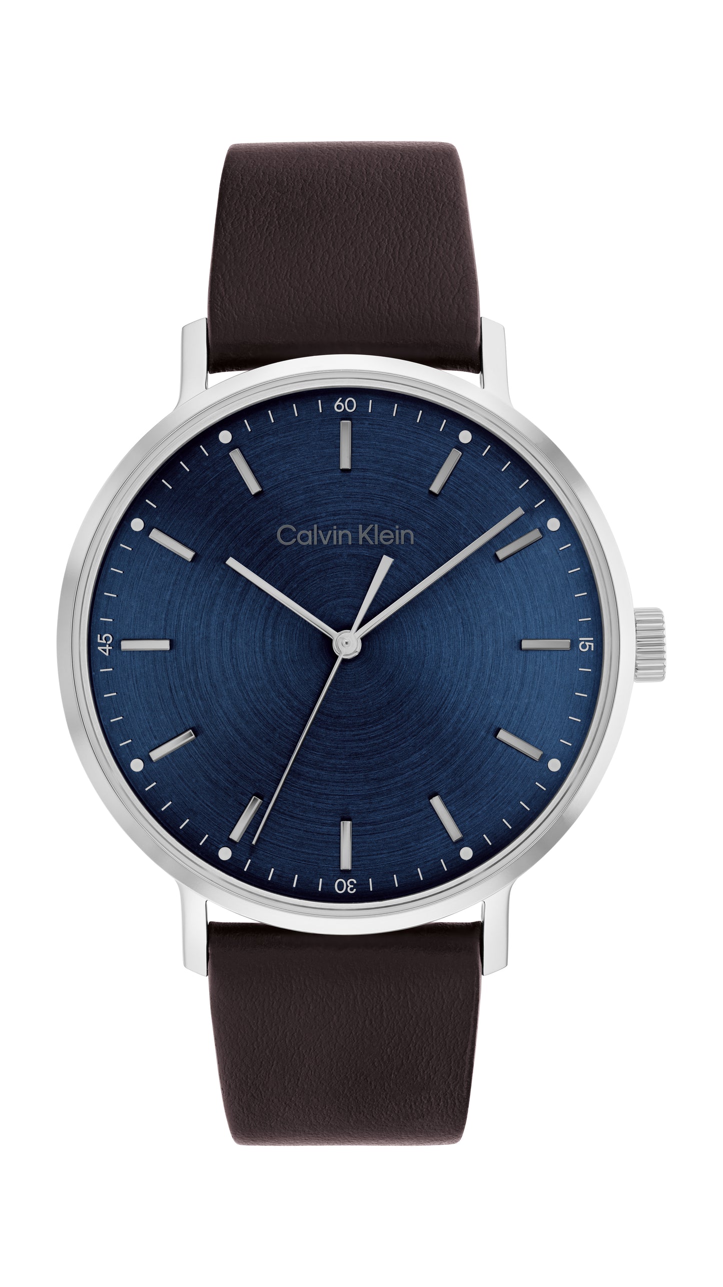 Orologio solo tempo a tre lancette da uomo di Calvin Klein della collezione timeless. La cassa è in acciaio inossidabile, di forma rotonda, con diametro di 42 mm. Lo spessore della cassa è di 7. 70 mm. Il cinturino è in pelle marrone. Larghezza del cinturino: 20 mm. Il quadrante è di colore blu. Il vetro è minerale. Il peso dell'orologio è di 45 g. Gli indici sono a bastoni. Il movimento è al quarzo. La resistenza all'acqua è di 3 atm.