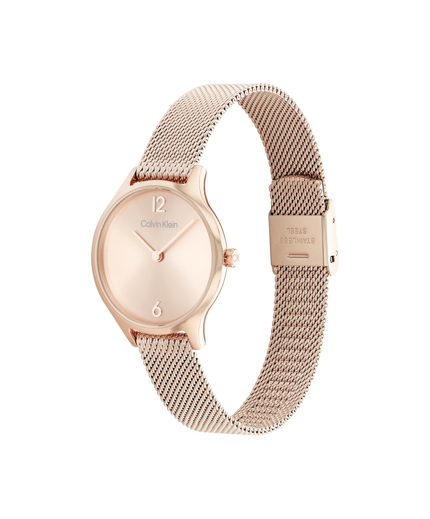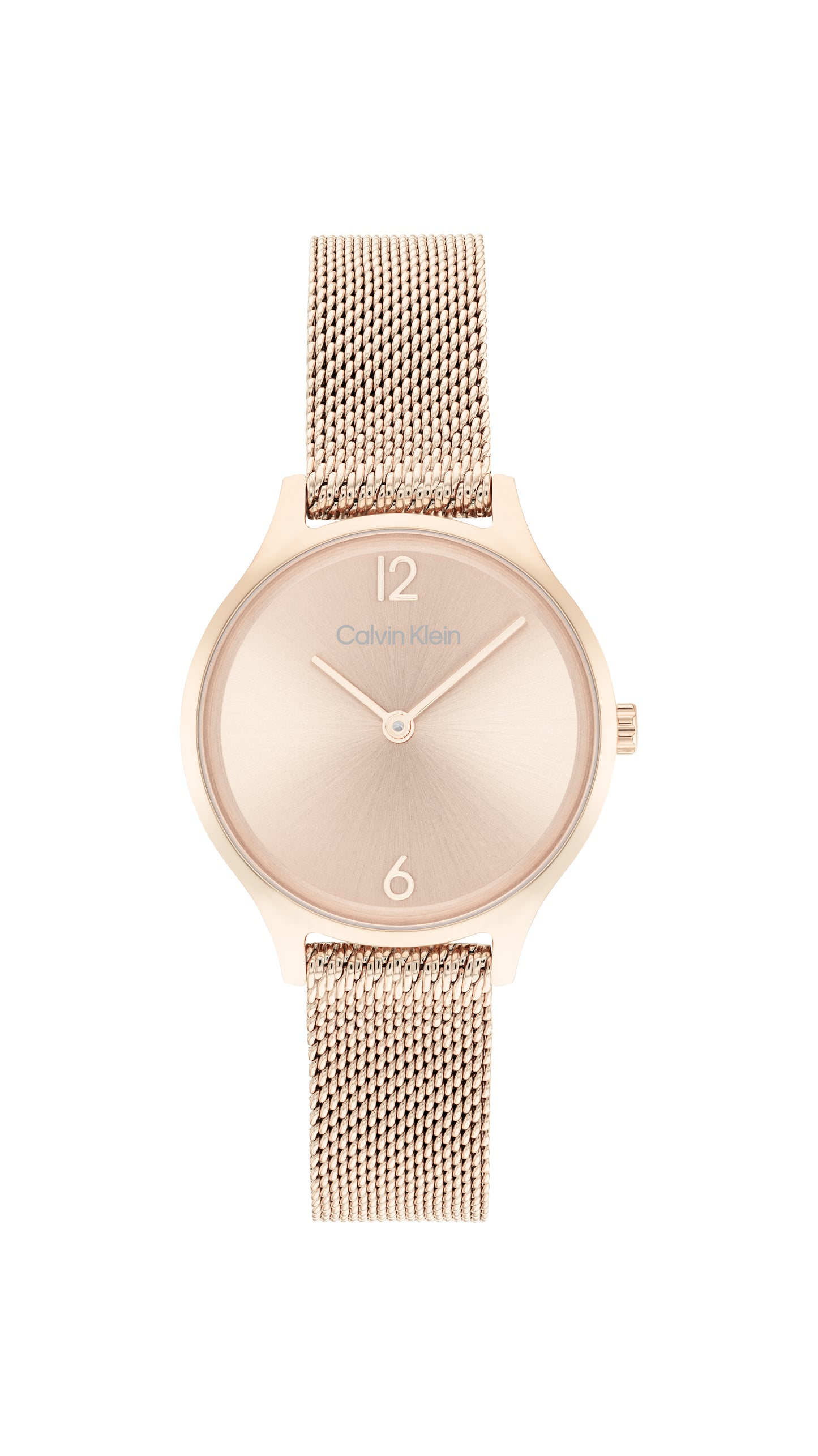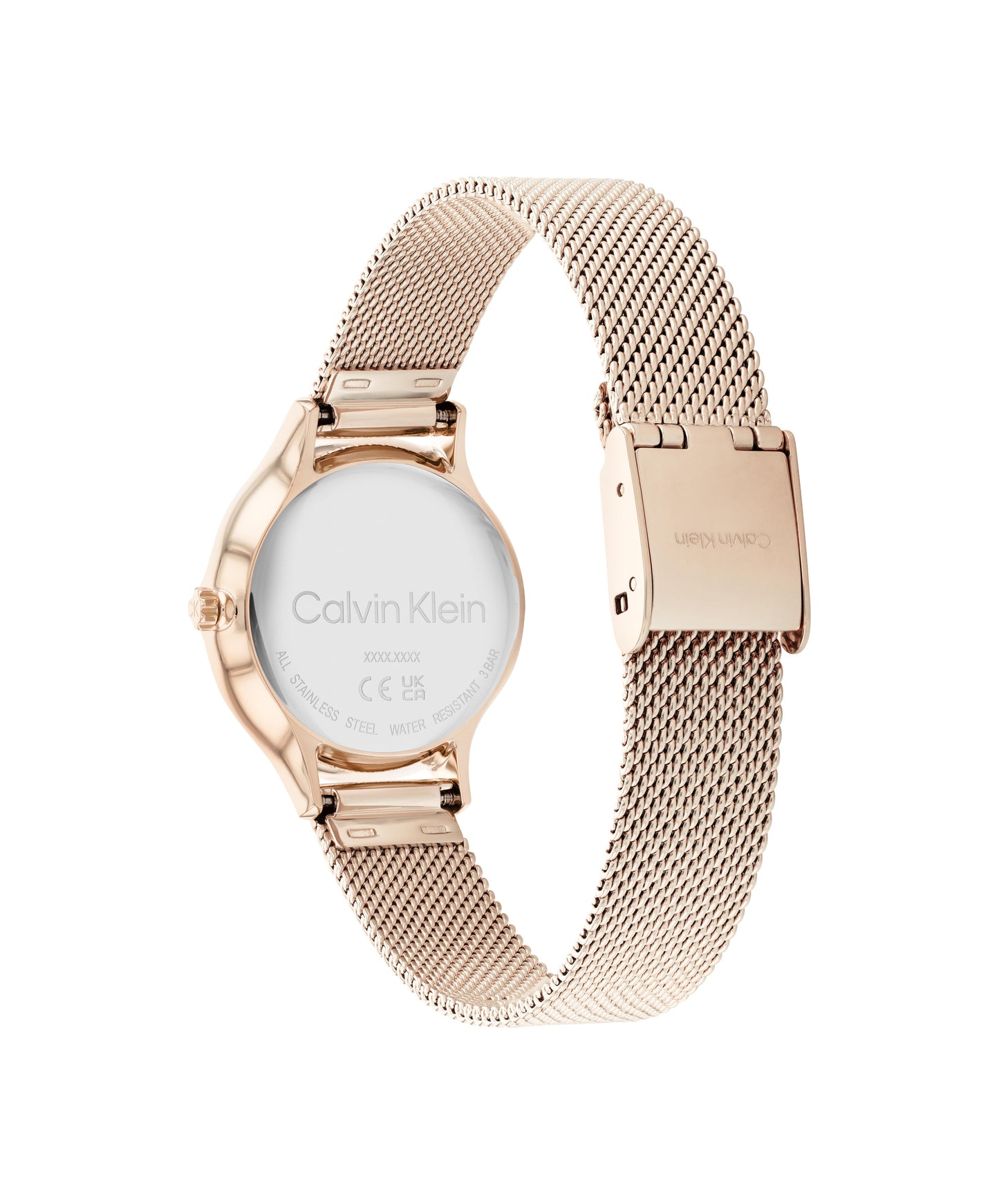 Orologio solo tempo a due lancette da donna di Calvin Klein della collezione timeless. La cassa è in acciaio inossidabile color oro rosa, di forma rotonda, con diametro di 28 mm. Il bracciale è in acciaio inossidabile color oro rosa. Il quadrante è rosato. Il vetro è minerale. Il movimento è al quarzo. La resistenza all'acqua è di 3 atm.