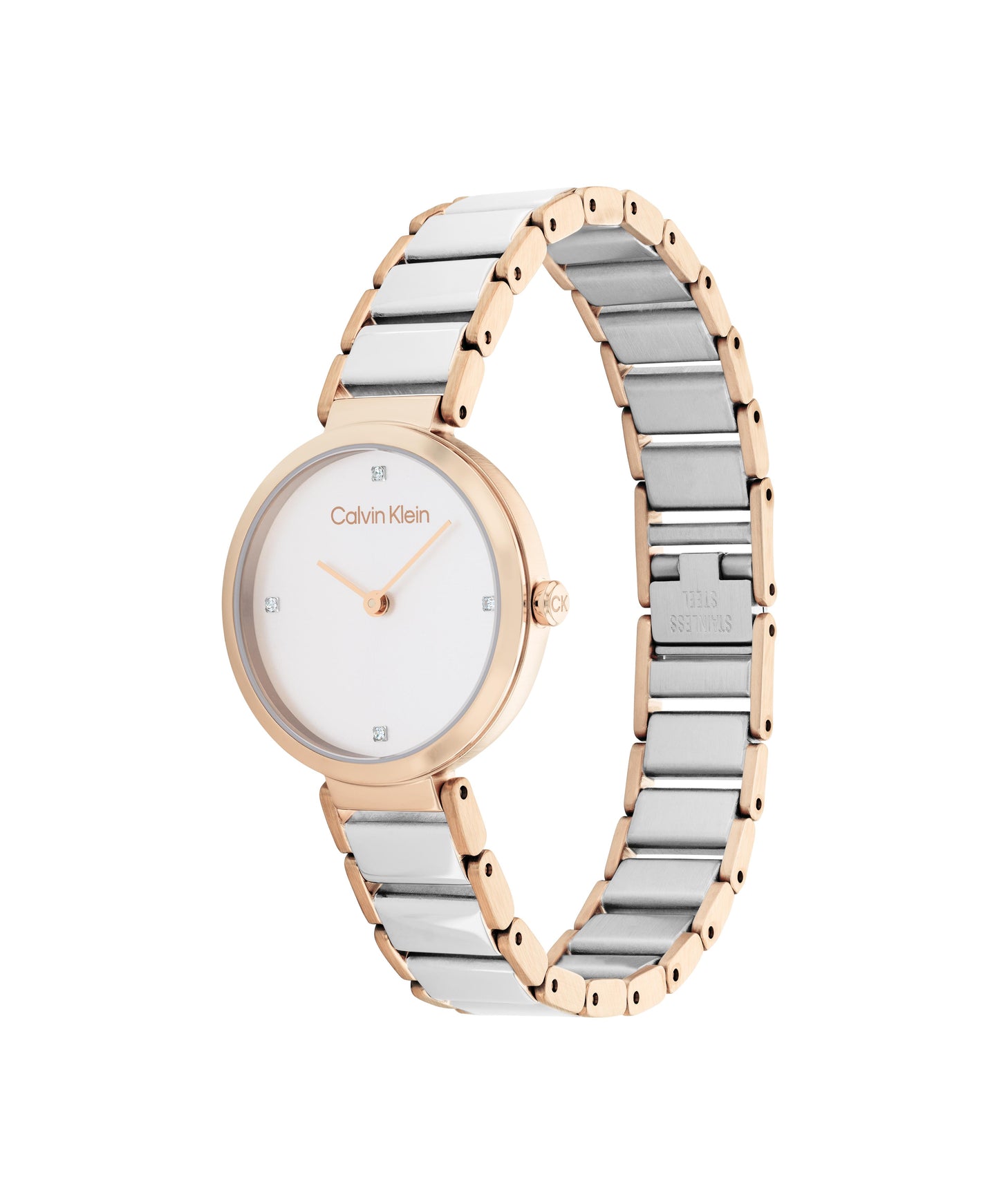 Orologio solo tempo a due lancette da donna di Calvin Klein della collezione timeless. La cassa è in acciaio inossidabile oro rosa, di forma rotonda, con diametro di 28 mm. Lo spessore della cassa è di 6,2 mm. Il bracciale è in acciaio inossidabile bicolore. Il quadrante è di colore bianco. Il vetro è minerale. Gli indici sono pietre. Il movimento è al quarzo. La resistenza all'acqua è di 3 atm.