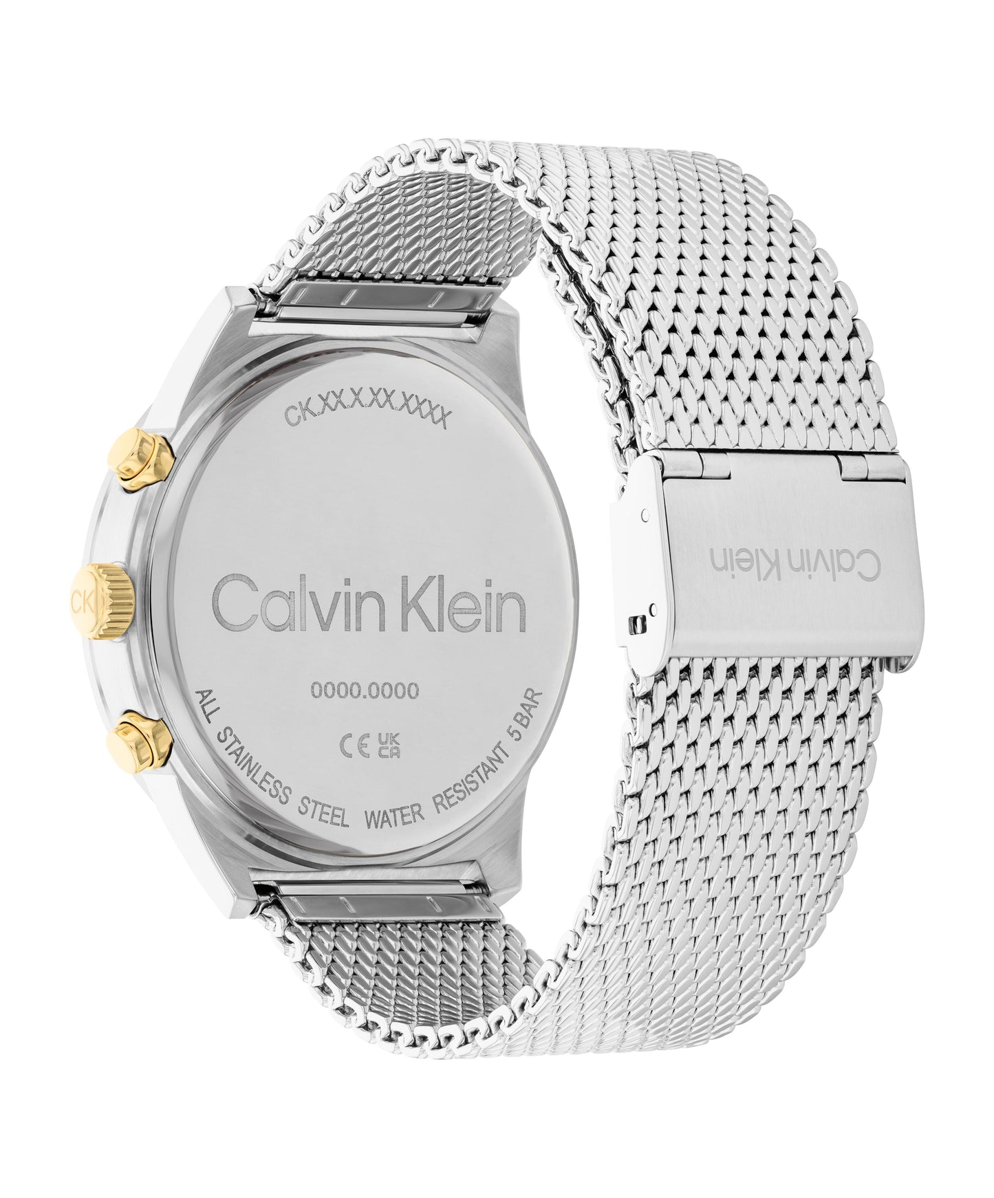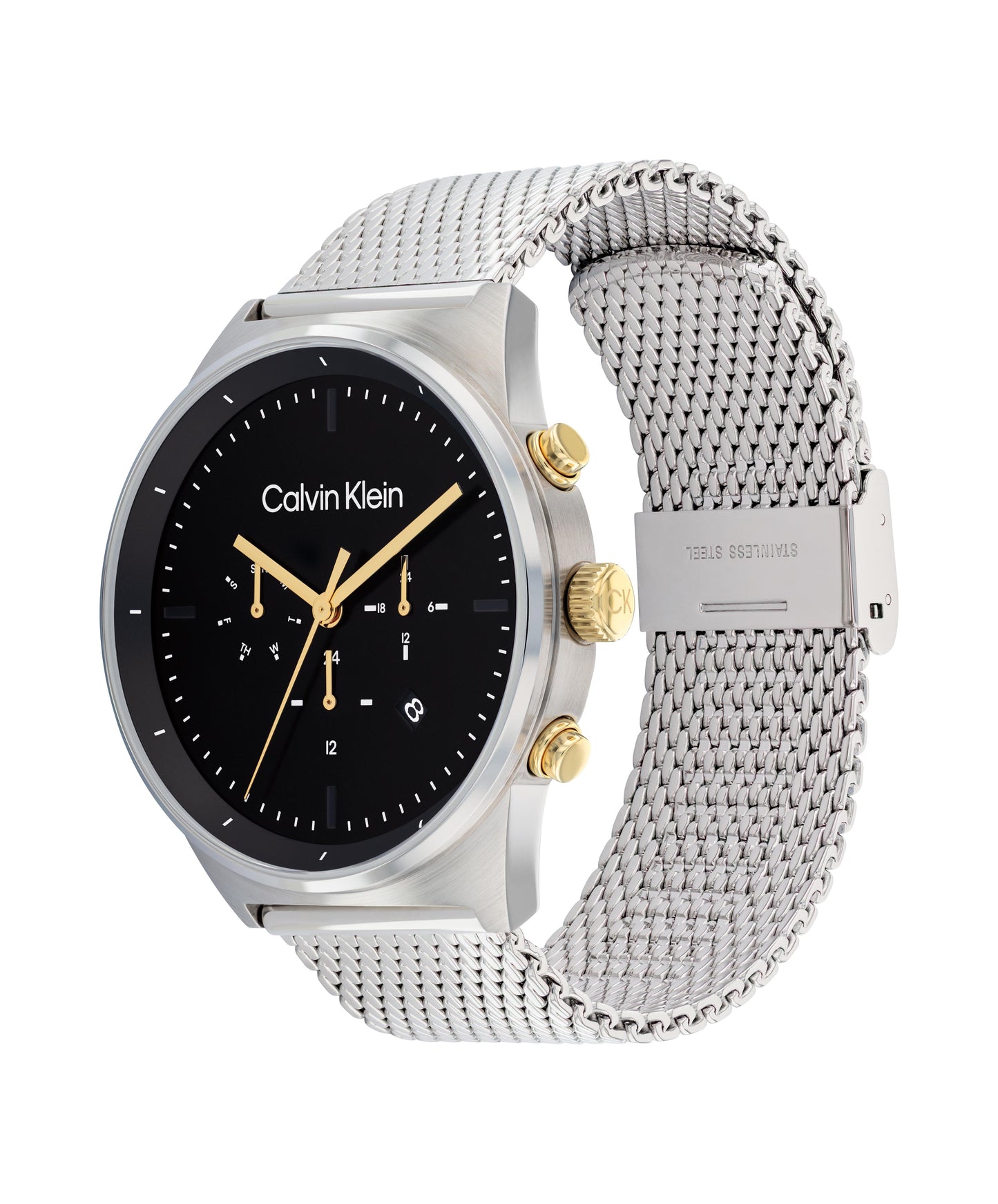 Orologio di Calvin Klein della collezione Timeless. Gioiello con cassa tonda di diametro 44mm, realizzata in acciaio inossidabile di colore argento e quadrante nero con indici. Cinturino in maglia, realizzato in acciaio inossidabile di colore argento . Display analogico e impermeabilità all'acqua fino a 5 ATM.