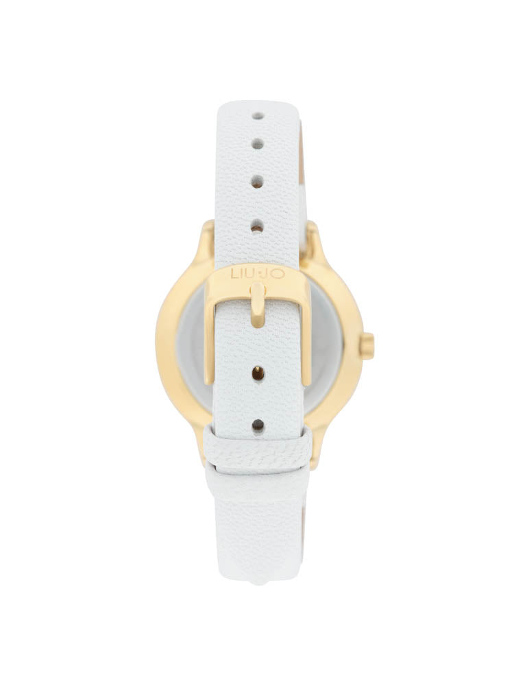 Orologio Liu Jo della collezione Aura Lux realizzato con cassa in acciaio color oro giallo con un diametro di 32mm. Il quadrante é bianco con indici dorati. Ha un vetro minerale e la resistenza all’acqua é di 3atm. Il cinturino é realizzato in pelle di colore bianco.