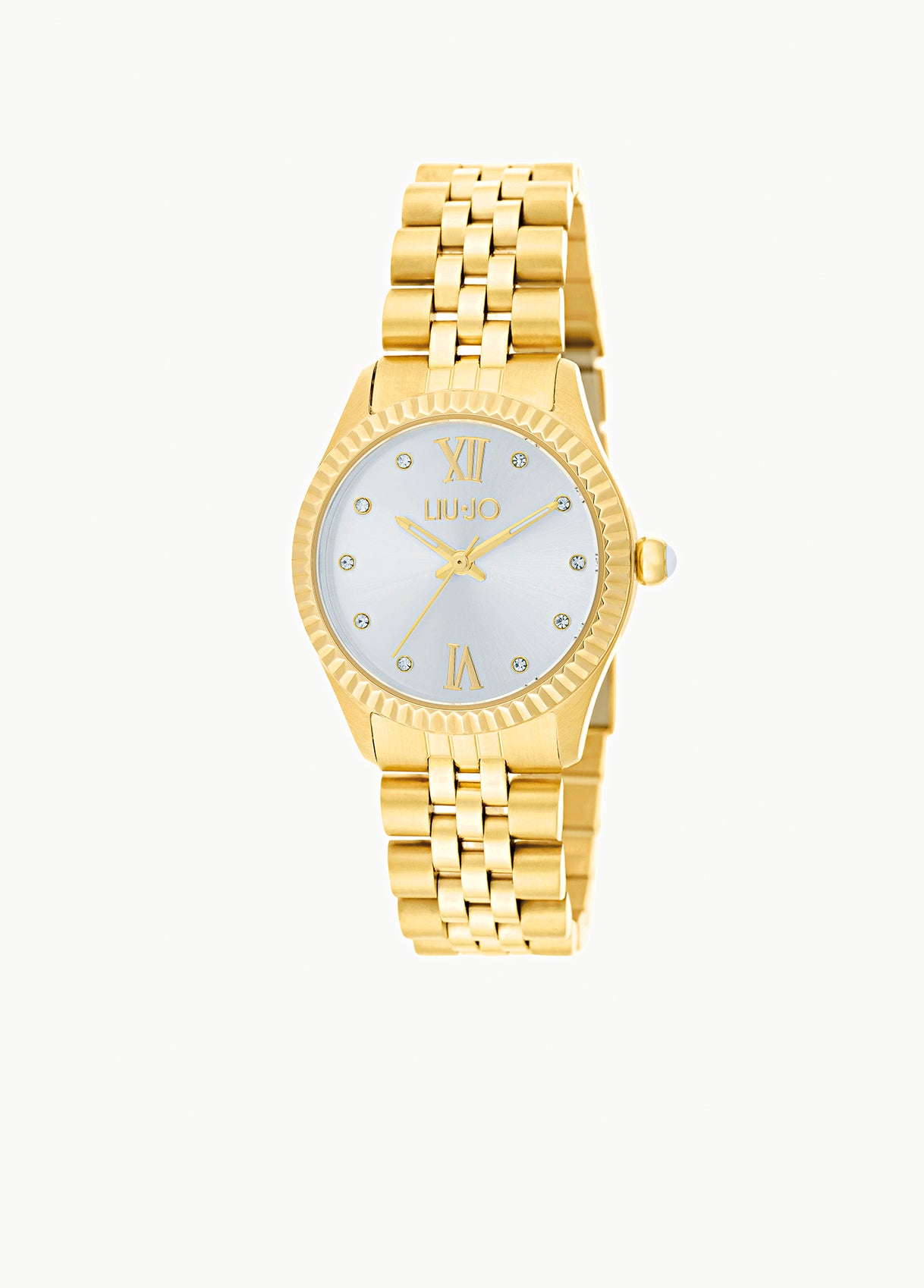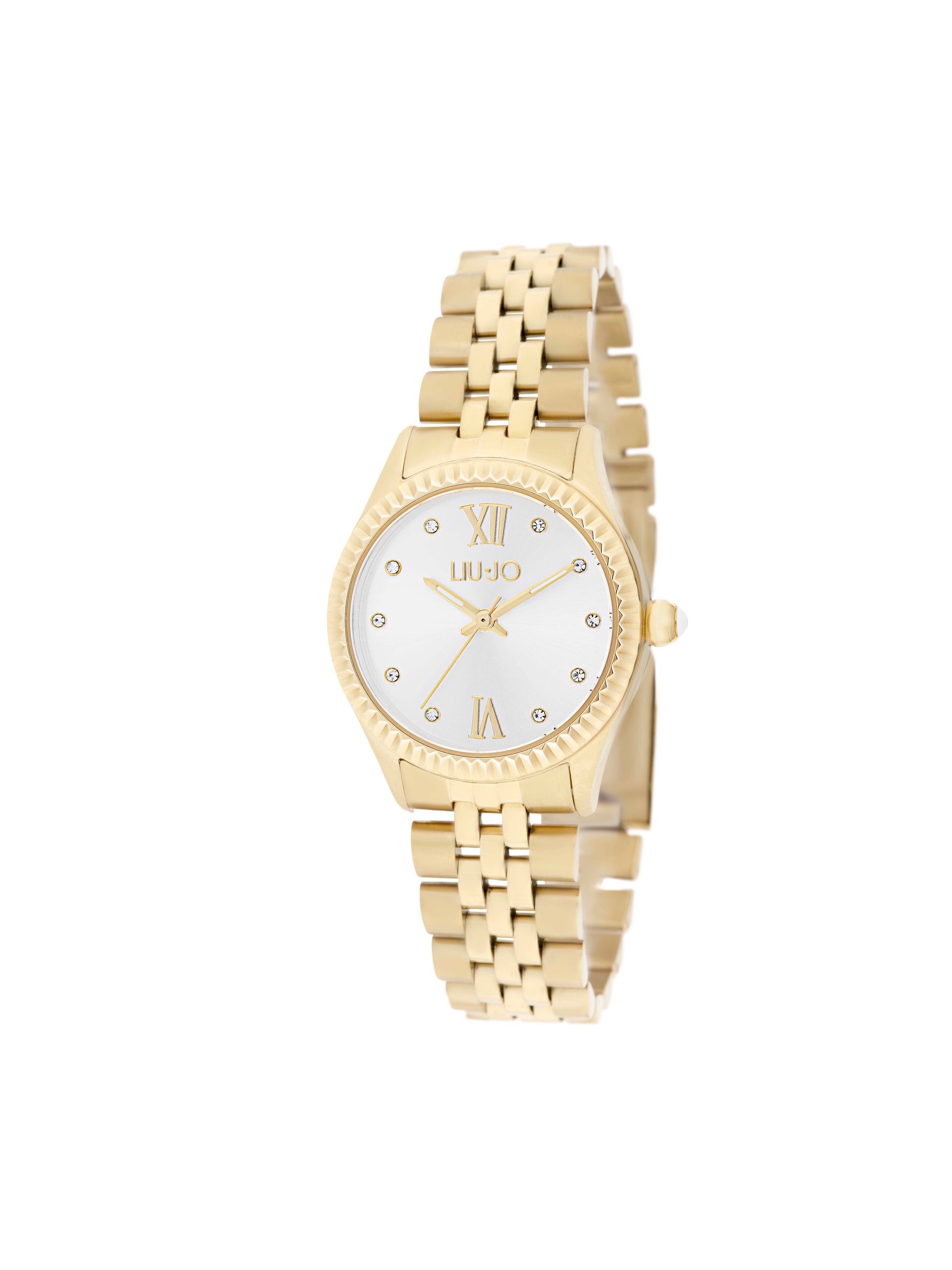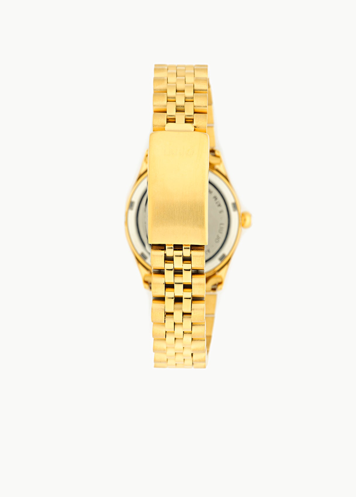 Orologio da donna solo tempo di Liujo della collezione tiny. Orologio con cassa in acciaio gold del diametro di 30 mm e quadrante sunray con cristalli sugli indici. Numeri romani al 12 e al 6. Il cinturino è in acciaio dorato con fibbia in acciaio e logo inciso. La resistenza all'acqua è di 5 atm.