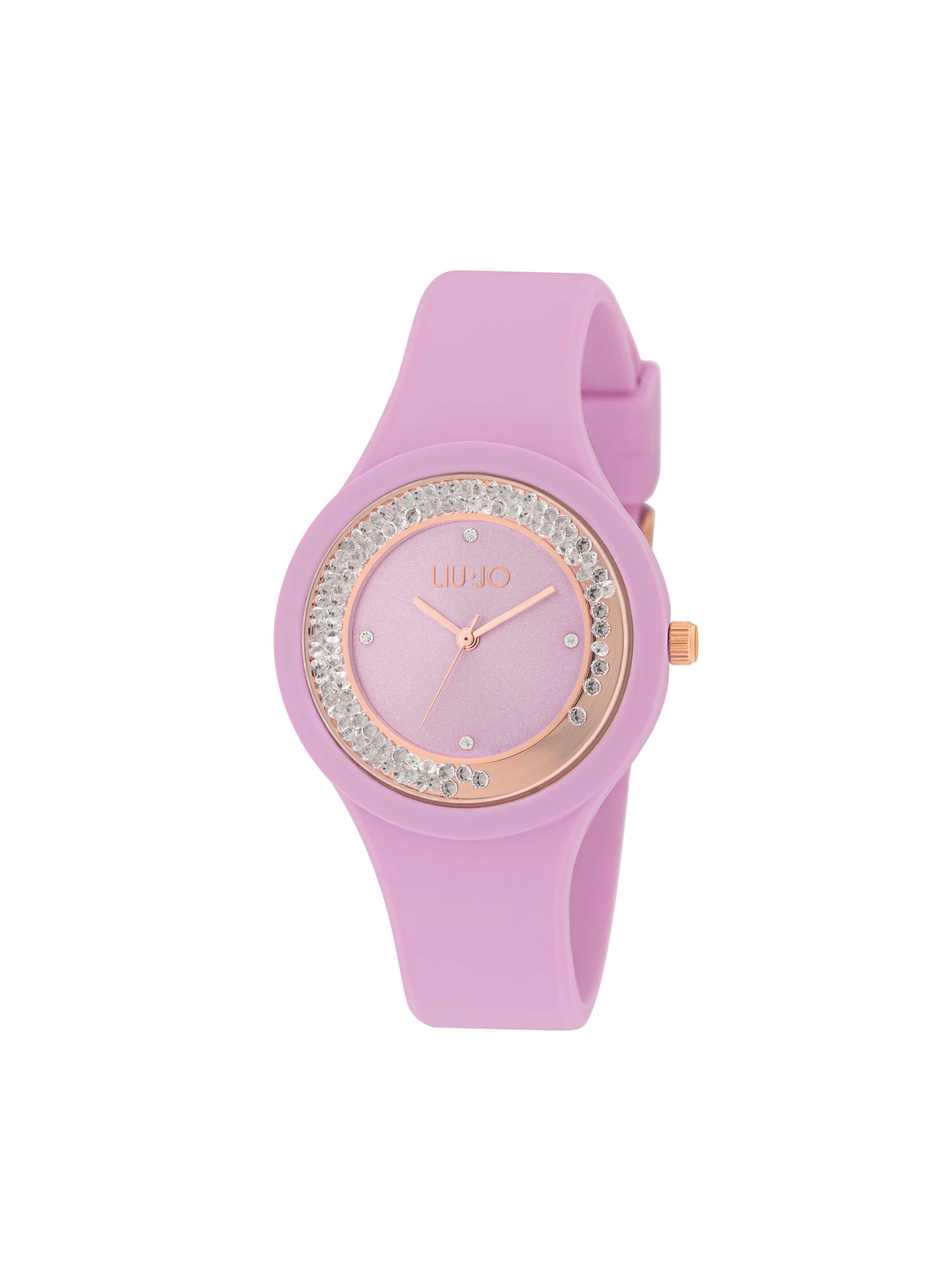 Orologio solo tempo con cassa in acciaio inossidabile di colore rosé e del diametro di 38 mm. Vetro minerale e quadrante di colore rose gold con cristalli sciolti nella lunetta. Cinturino in silicone di colore lilla. Resistenza all'acqua di 3 atm