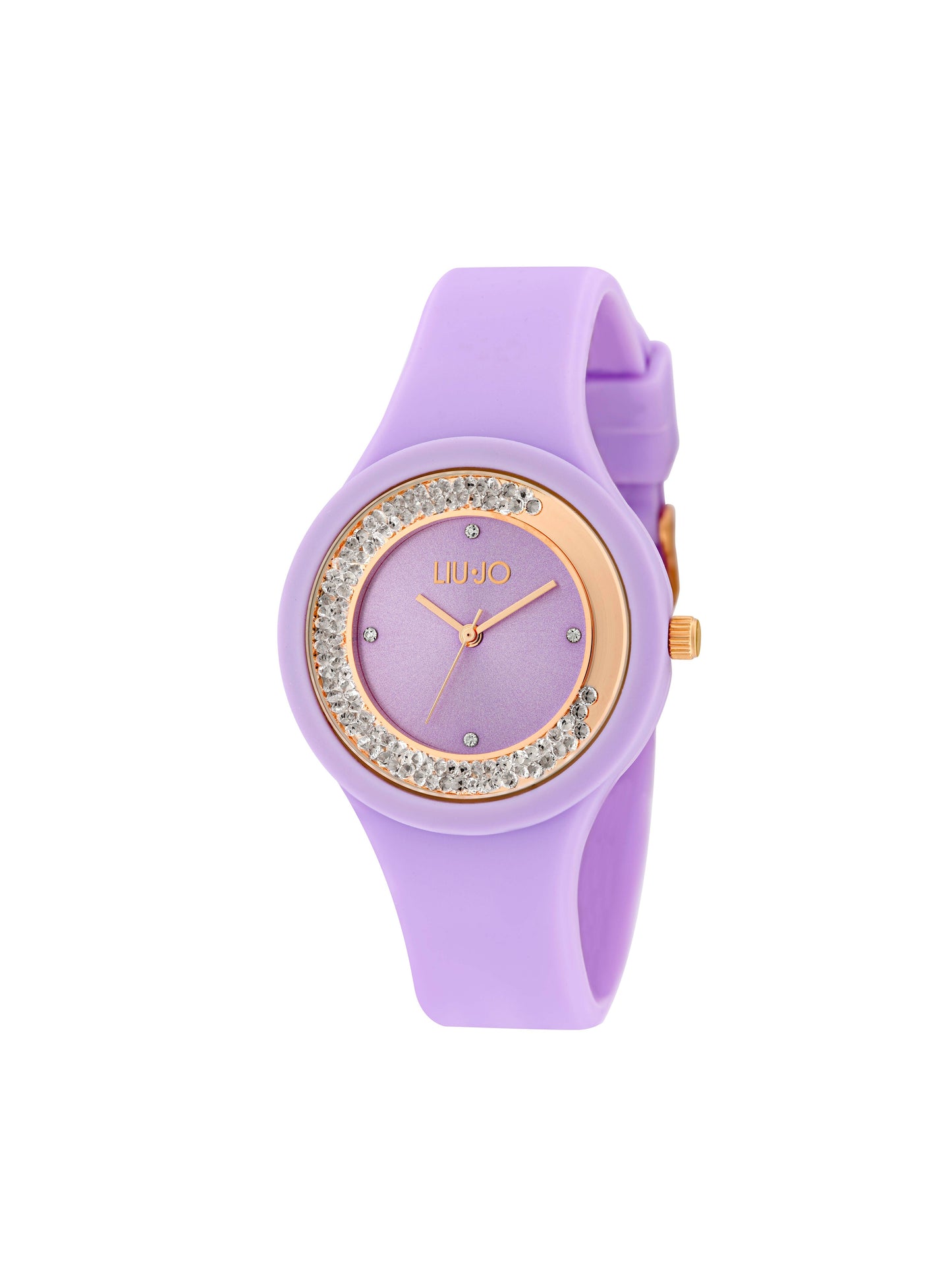 Orologio solo tempo con cassa in acciaio inossidabile di colore rosato e del diametro di 38 mm. Vetro minerale e quadrante di colore oro rosa con cristalli sciolti nella lunetta. Cinturino in silicone di colore glicine. Resistenza all'acqua di 3 atm