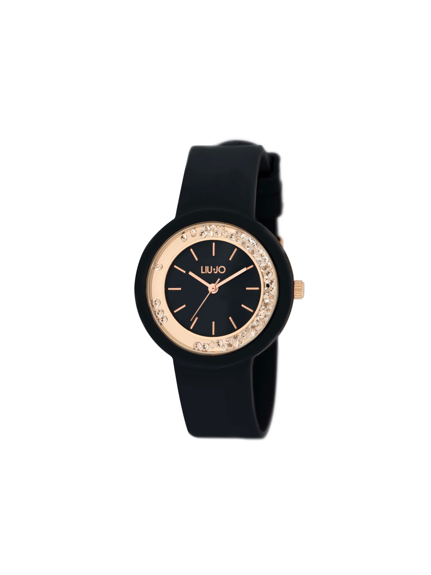 Orologio solo tempo con cassa in acciaio inossidabile di colore rosato e del diametro di 33 mm. Vetro minerale e quadrante di colore oro rosa con cristalli sciolti nella lunetta. Cinturino in silicone di colore nero. Resistenza all'acqua di 3 atm