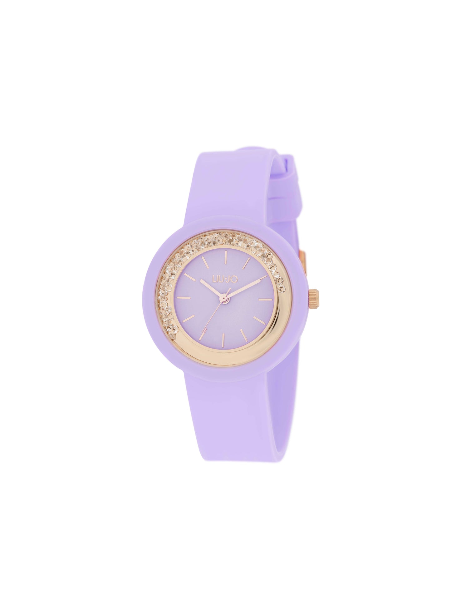 Orologio solo tempo con cassa in acciaio inossidabile di colore rosato e del diametro di 33 mm. Vetro minerale e quadrante di colore oro rosa con cristalli sciolti nella lunetta. Cinturino in silicone di colore lilla. Resistenza all'acqua di 3 atm