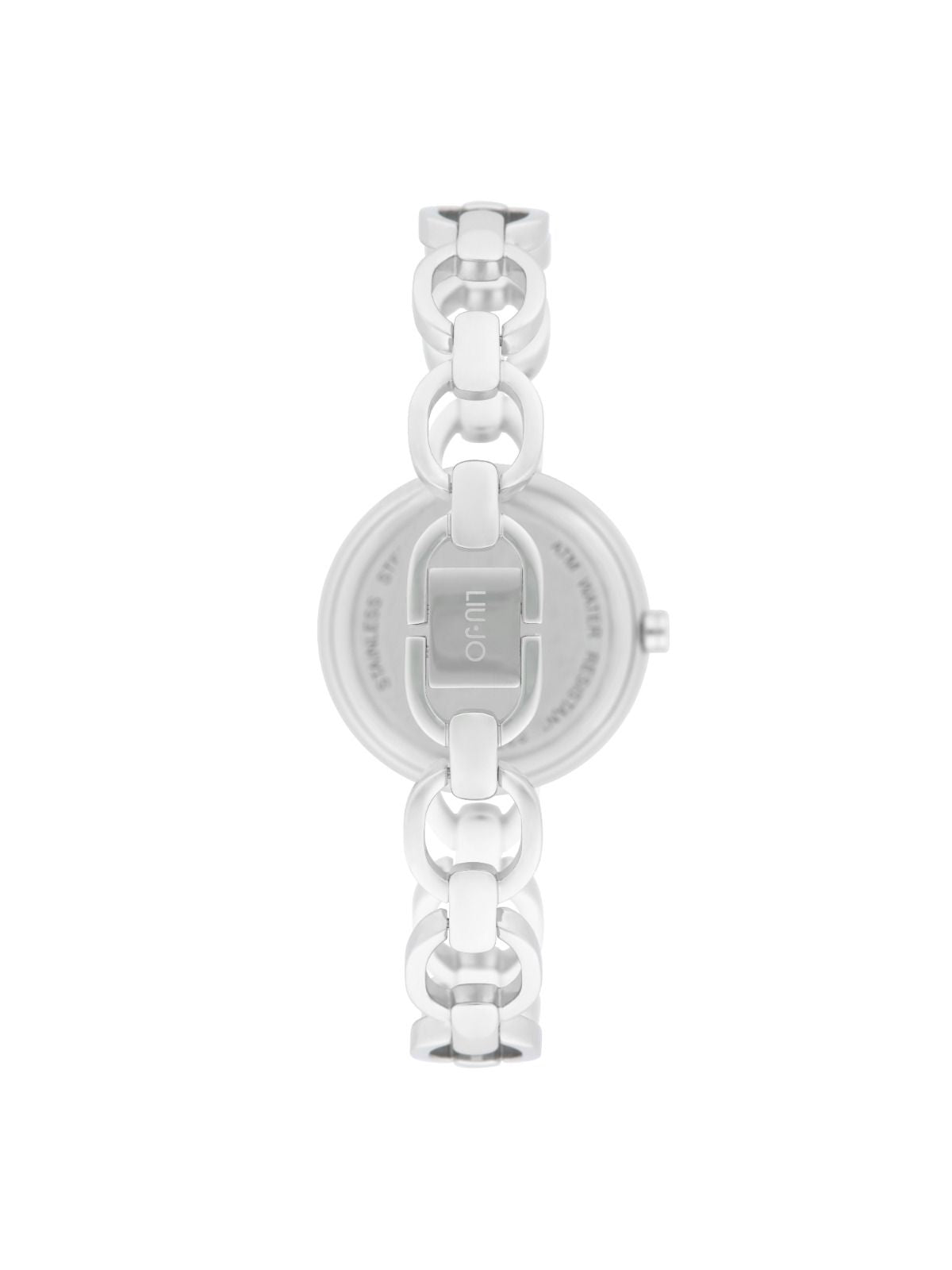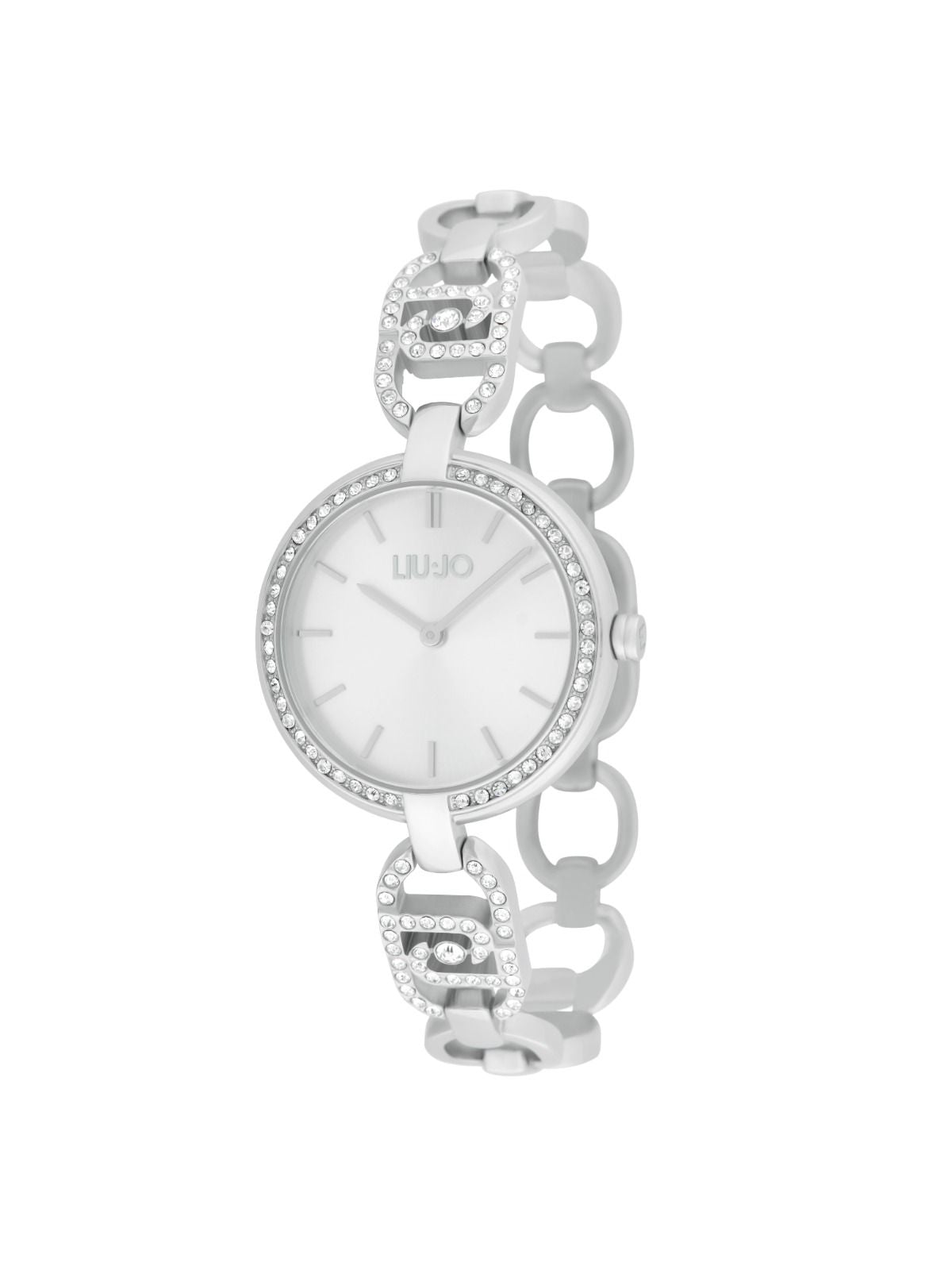Orologio da donna di Liu-Jo della collezione Glare. La cassa è in acciaio di colore argento dal diametro 32 mm. Il vetro è minerale. Il colore del quadrante è argento con zirconi su lunetta. Il cinturino è braccialato, in acciaio, di colore argento . La resistenza all'acqua è di 3 ATM.