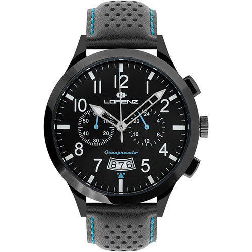 Orologio cronografo fondo nero e cinturino in pelle nero con inserti azzurri.