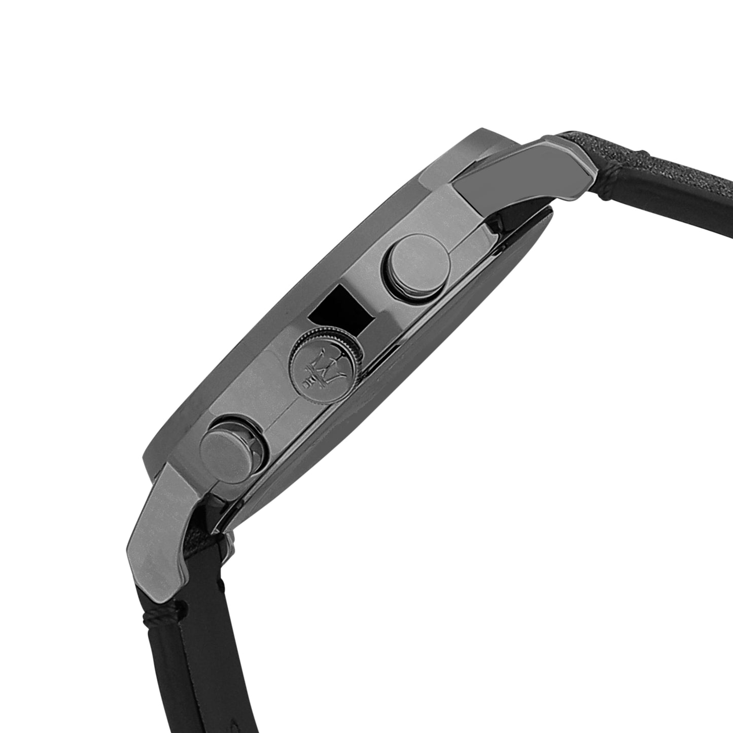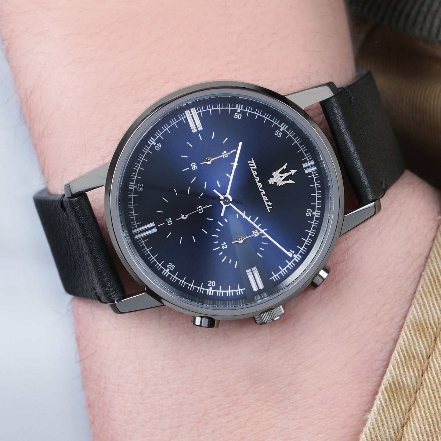 Orologio cronografo realizzato in acciaio, pvd canna di fucile e pelle, con tre contatori. La cassa ha dimensione di 42 x 51,5 mm con finitura acciaio lucido, quadrante di colore sunray blu e vetro minerale. Orologio con bracciale in pelle di colore nero e chiusura ad ardiglione. La resistenza all'acqua è di 5 atm.