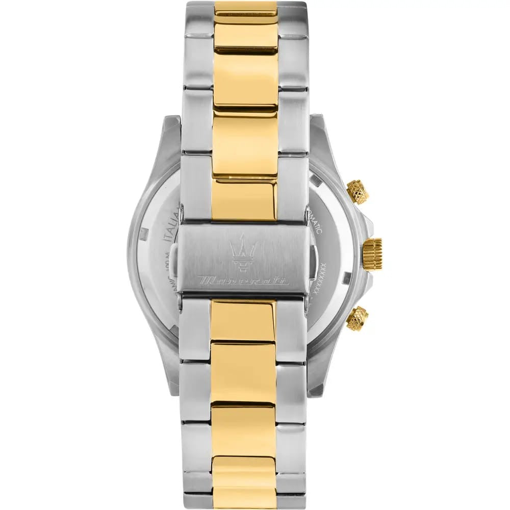 Orologio cronografo in acciaio. Orologio con cassa in acciaio satinato della dimensione di 43mm e ghiera in ceramica blu. Bracciale in metallo di colore silver e oro con chiusura fibbia deployante con pulsanti. Orologio con vetro minerale con lente d'ingrandimento. Funzioni: cronografo e datario, la resistenza all'acqua è di 10 atm.