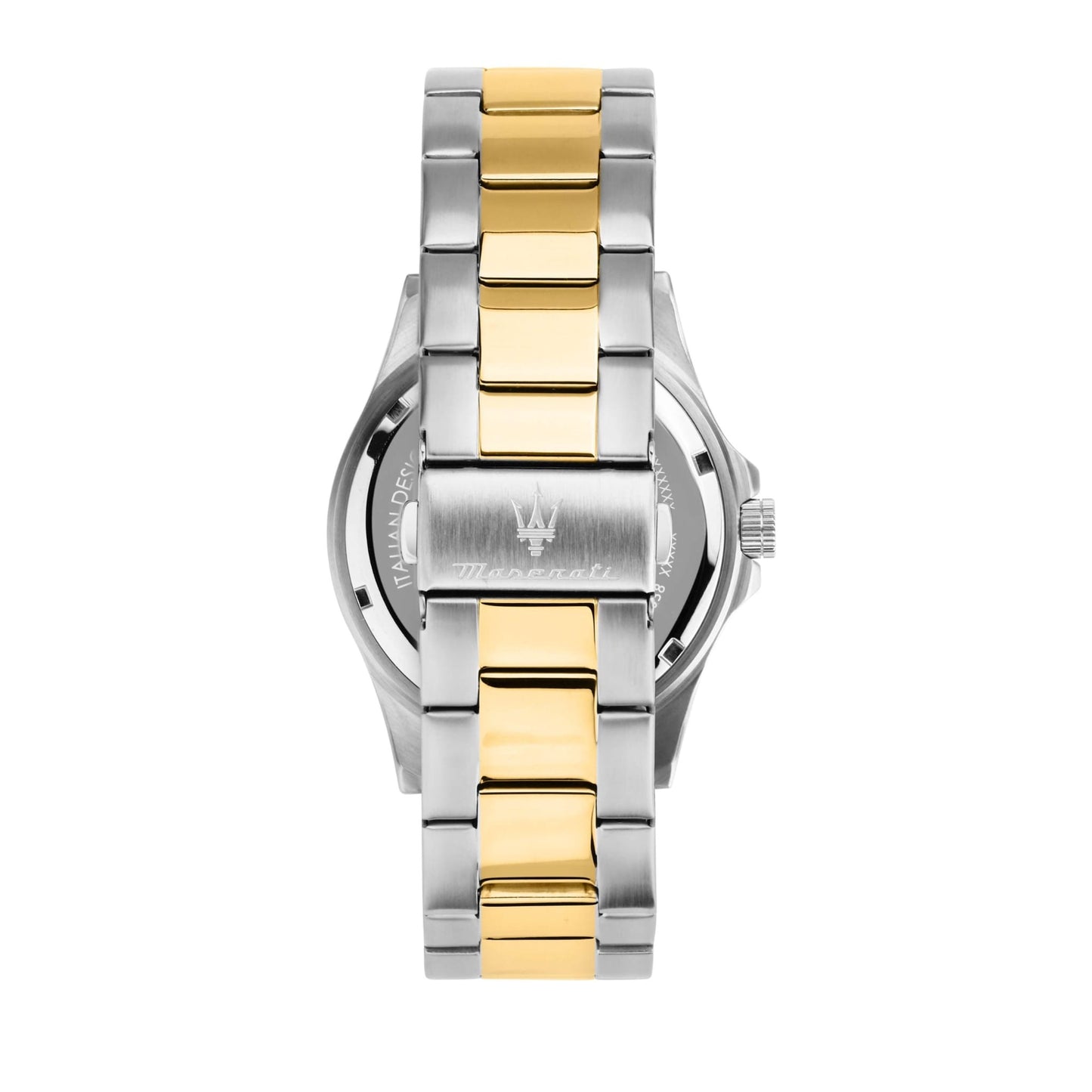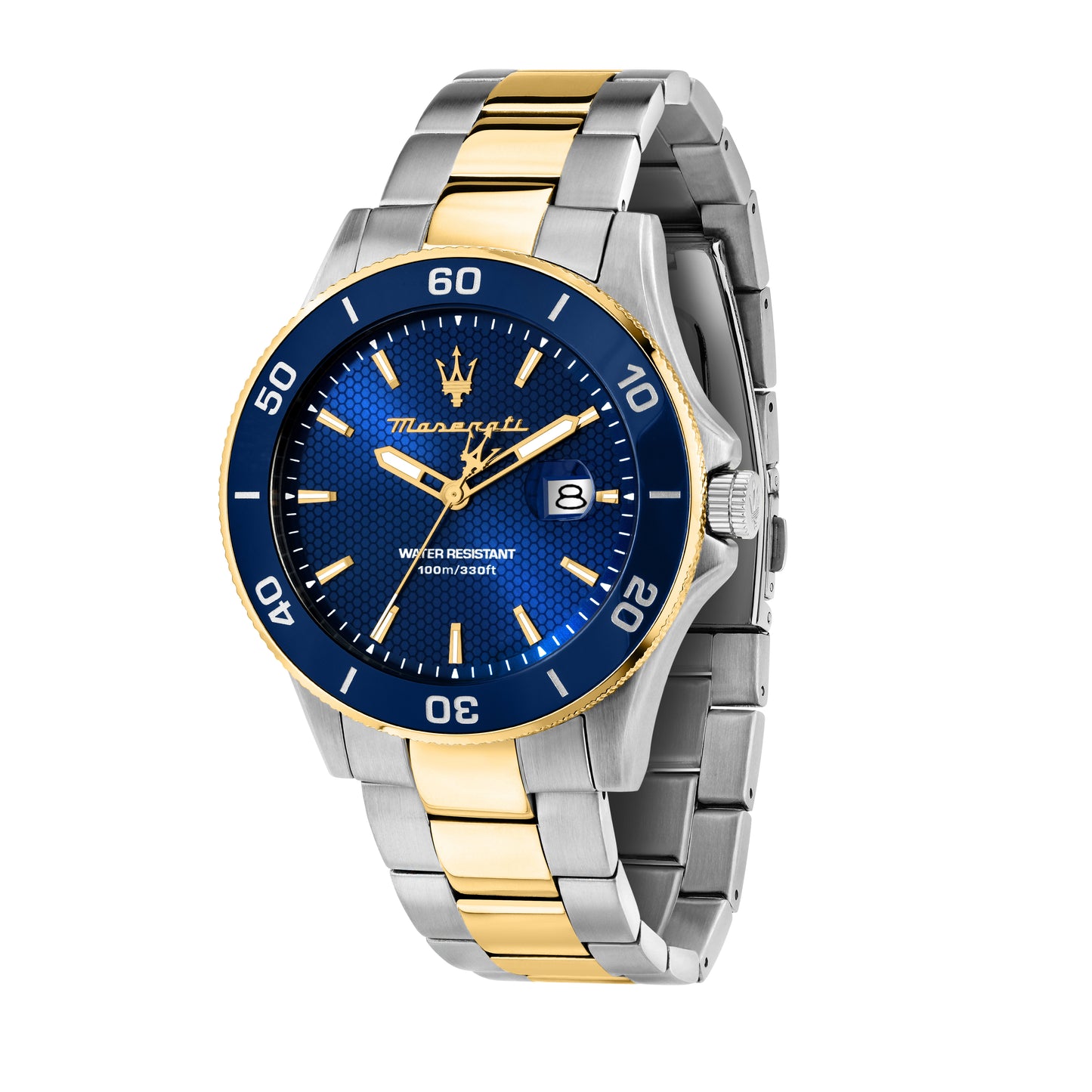 Orologio solo tempo in acciaio. Orologio con cassa in acciaio satinato della dimensione di 43mm e ghiera in ceramica blu. Bracciale in metallo di colore silver e oro con chiusura fibbia deployante con pulsanti. Orologio con vetro minerale con lente d'ingrandimento. Funzioni: tempo e data, la resistenza all'acqua è di 10 atm.