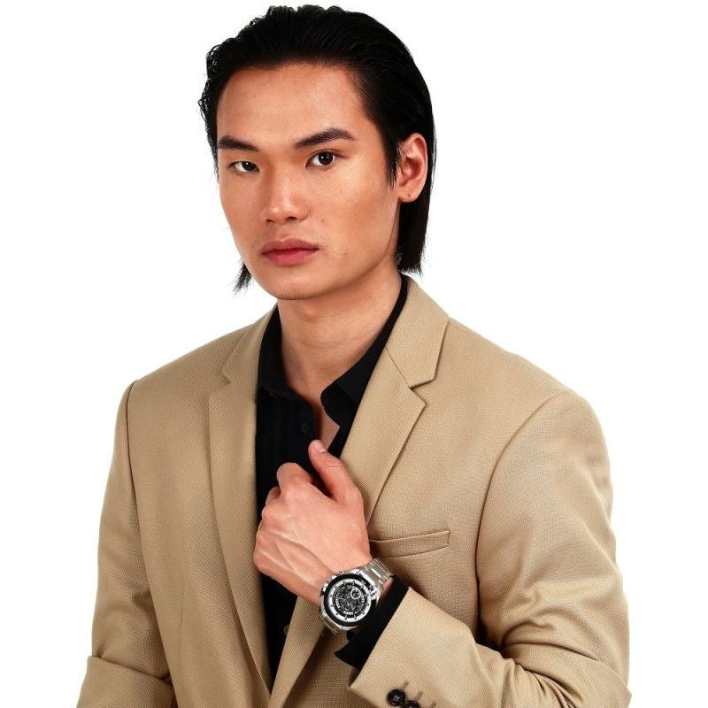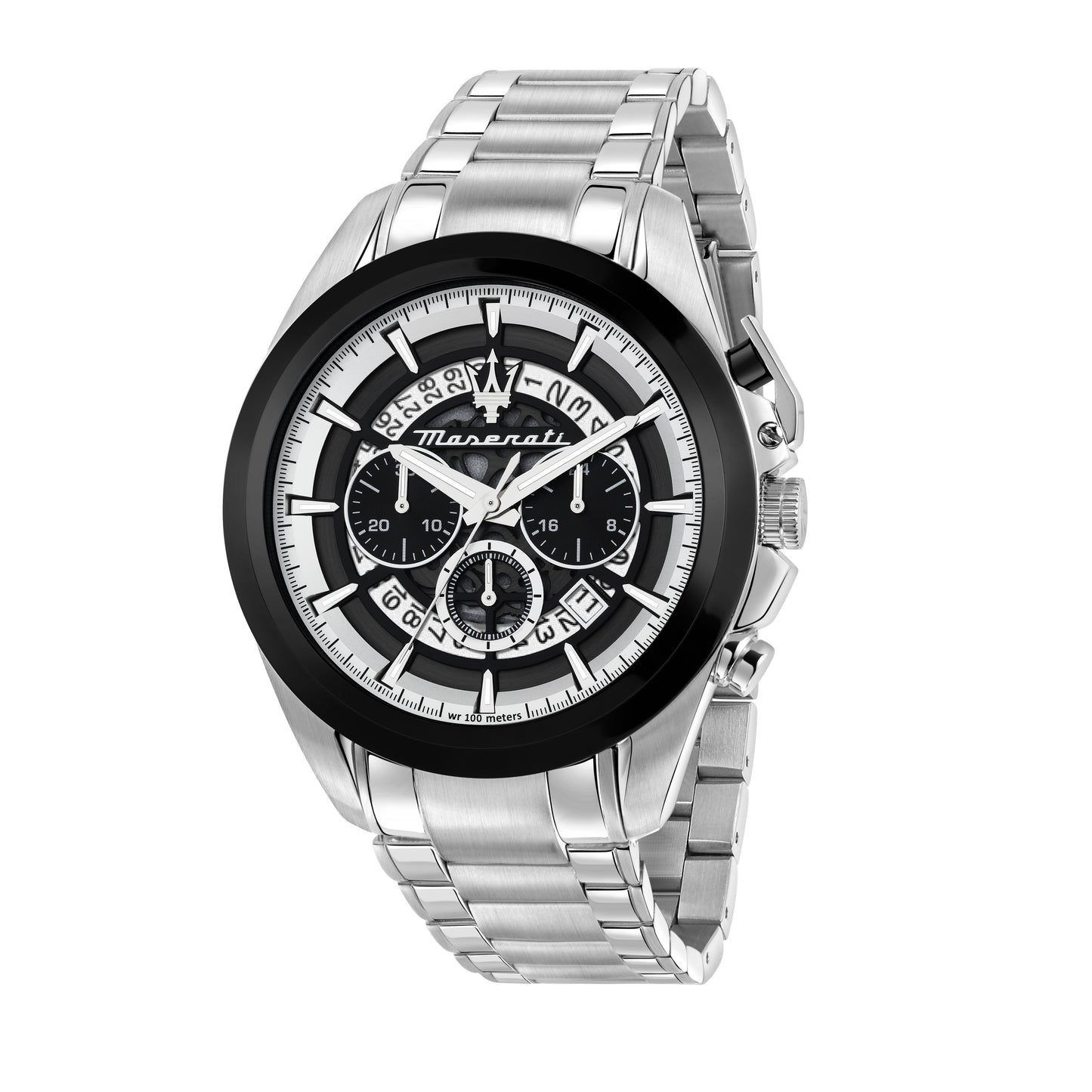 Orologio cronografo in acciaio. Orologio con cassa in acciaio satinato della dimensione di 45 mm. Bracciale in metallo di colore silver con chiusura fibbia deployante con pulsanti. Orologio con vetro minerale con lente d'ingrandimento. Funzioni: cronografo e datario, la resistenza all'acqua è di 10 atm.